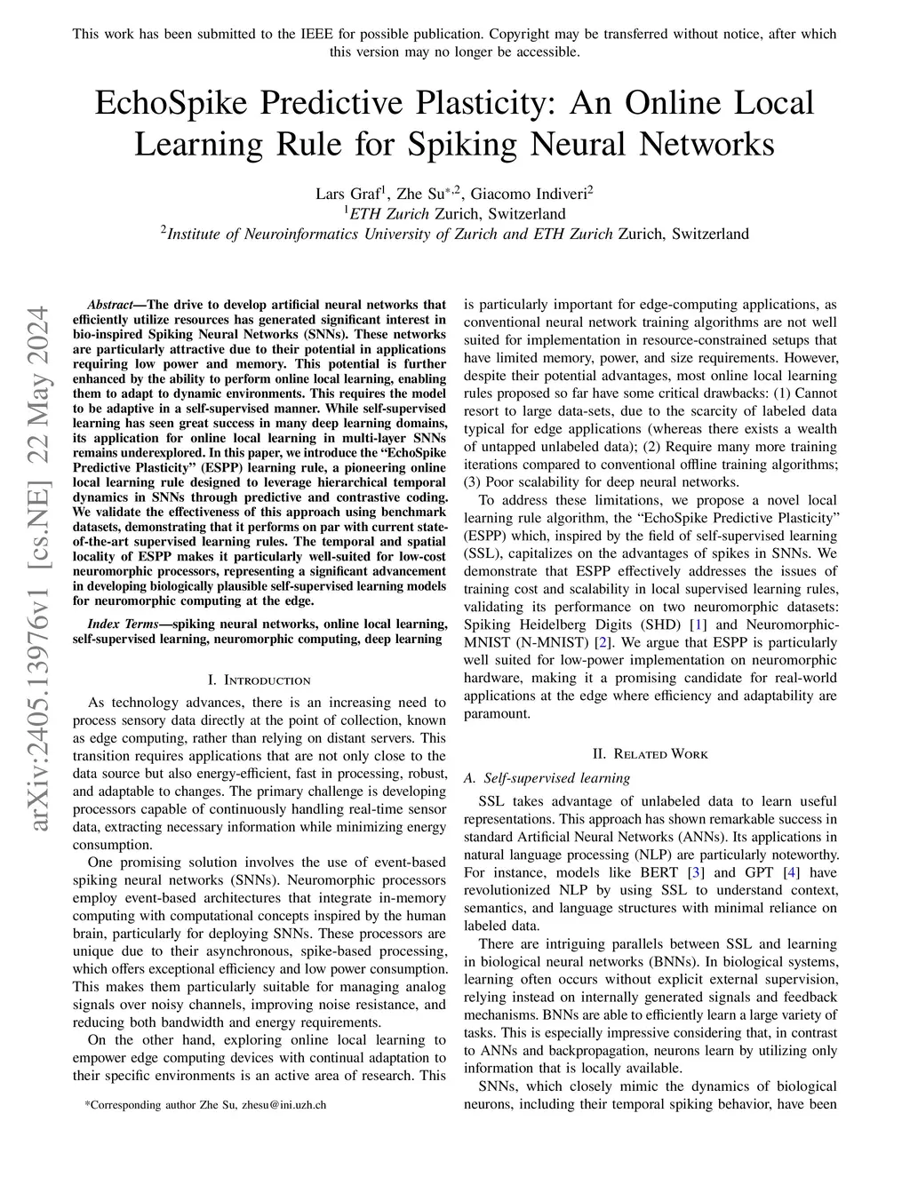 The drive to develop artificial neural networks that efficiently utilize resources has generated significant interest in bio-inspired Spiking Neural Networks (SNNs). These networks are particularly attractive due to their potential in applications requiring low power and memory. This potential is further enhanced by the ability to perform online local learning, enabling them to adapt to dynamic environments. This requires the model to be adaptive in a self-supervised manner. While self-supervised learning has seen great success in many deep learning domains, its application for online local learning in multi-layer SNNs remains underexplored. In this paper, we introduce the "EchoSpike Predictive Plasticity" (ESPP) learning rule, a pioneering online local learning rule designed to leverage hierarchical temporal dynamics in SNNs through predictive and contrastive coding. We validate the effectiveness of this approach using benchmark datasets, demonstrating that it performs on par with current state-of-the-art supervised learning rules. The temporal and spatial locality of ESPP makes it particularly well-suited for low-cost neuromorphic processors, representing a significant advancement in developing biologically plausible self-supervised learning models for neuromorphic computing at the edge.