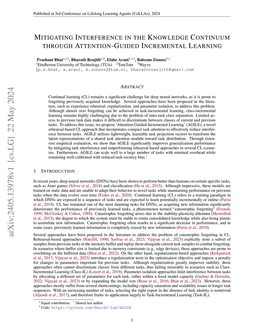 Continual learning (CL) remains a significant challenge for deep neural networks, as it is prone to forgetting previously acquired knowledge. Several approaches have been proposed in the literature, such as experience rehearsal, regularization, and parameter isolation, to address this problem. Although almost zero forgetting can be achieved in task-incremental learning, class-incremental learning remains highly challenging due to the problem of inter-task class separation. Limited access to previous task data makes it difficult to discriminate between classes of current and previous tasks. To address this issue, we propose `Attention-Guided Incremental Learning' (AGILE), a novel rehearsal-based CL approach that incorporates compact task attention to effectively reduce interference between tasks. AGILE utilizes lightweight, learnable task projection vectors to transform the latent representations of a shared task attention module toward task distribution. Through extensive empirical evaluation, we show that AGILE significantly improves generalization performance by mitigating task interference and outperforming rehearsal-based approaches in several CL scenarios. Furthermore, AGILE can scale well to a large number of tasks with minimal overhead while remaining well-calibrated with reduced task-recency bias.