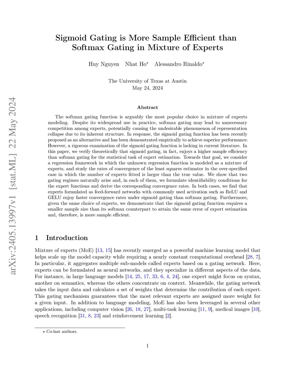 The softmax gating function is arguably the most popular choice in mixture of experts modeling. Despite its widespread use in practice, softmax gating may lead to unnecessary competition among experts, potentially causing the undesirable phenomenon of representation collapse due to its inherent structure. In response, the sigmoid gating function has been recently proposed as an alternative and has been demonstrated empirically to achieve superior performance. However, a rigorous examination of the sigmoid gating function is lacking in current literature. In this paper, we verify theoretically that sigmoid gating, in fact, enjoys a higher sample efficiency than softmax gating for the statistical task of expert estimation. Towards that goal, we consider a regression framework in which the unknown regression function is modeled as a mixture of experts, and study the rates of convergence of the least squares estimator in the over-specified case in which the number of experts fitted is larger than the true value. We show that two gating regimes naturally arise and, in each of them, we formulate identifiability conditions for the expert functions and derive the corresponding convergence rates. In both cases, we find that experts formulated as feed-forward networks with commonly used activation such as and enjoy faster convergence rates under sigmoid gating than softmax gating. Furthermore, given the same choice of experts, we demonstrate that the sigmoid gating function requires a smaller sample size than its softmax counterpart to attain the same error of expert estimation and, therefore, is more sample efficient.