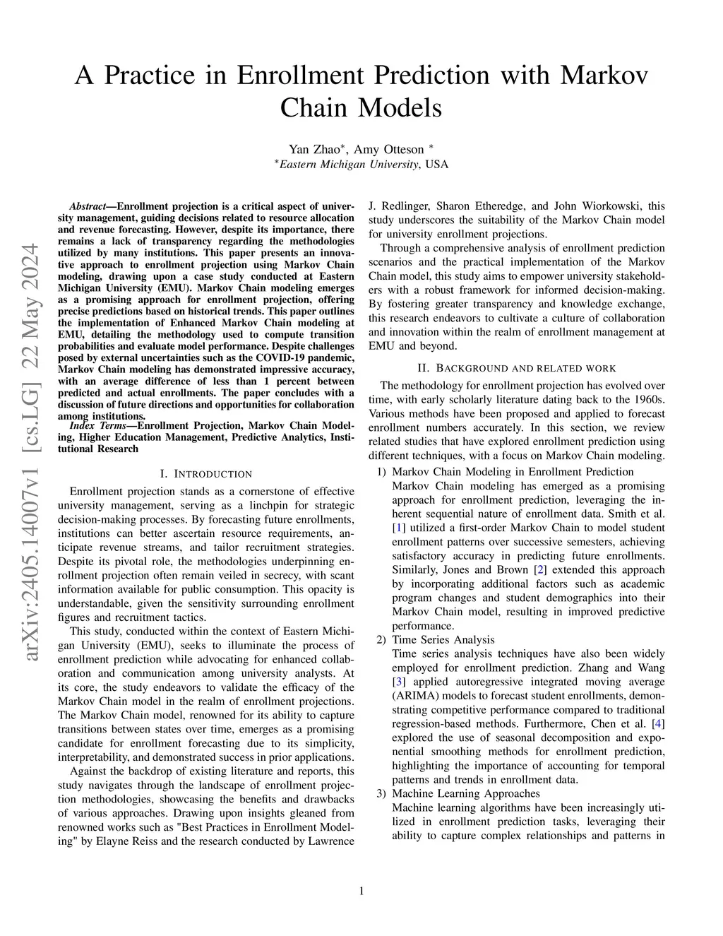 Enrollment projection is a critical aspect of university management, guiding decisions related to resource allocation and revenue forecasting. However, despite its importance, there remains a lack of transparency regarding the methodologies utilized by many institutions. This paper presents an innovative approach to enrollment projection using Markov Chain modeling, drawing upon a case study conducted at Eastern Michigan University (EMU). Markov Chain modeling emerges as a promising approach for enrollment projection, offering precise predictions based on historical trends. This paper outlines the implementation of Enhanced Markov Chain modeling at EMU, detailing the methodology used to compute transition probabilities and evaluate model performance. Despite challenges posed by external uncertainties such as the COVID-19 pandemic, Markov Chain modeling has demonstrated impressive accuracy, with an average difference of less than 1 percent between predicted and actual enrollments. The paper concludes with a discussion of future directions and opportunities for collaboration among institutions.