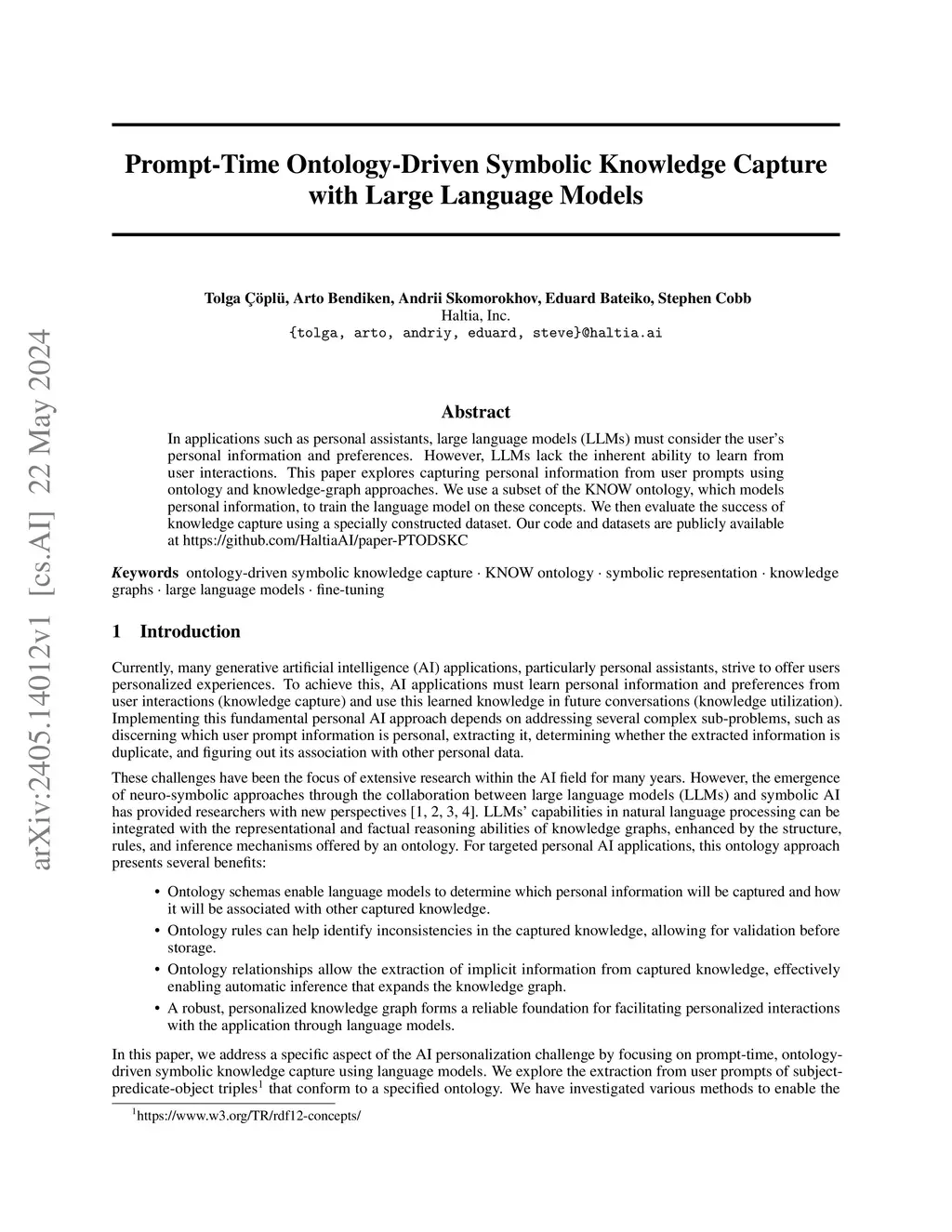 In applications such as personal assistants, large language models (LLMs) must consider the user's personal information and preferences. However, LLMs lack the inherent ability to learn from user interactions. This paper explores capturing personal information from user prompts using ontology and knowledge-graph approaches. We use a subset of the KNOW ontology, which models personal information, to train the language model on these concepts. We then evaluate the success of knowledge capture using a specially constructed dataset. Our code and datasets are publicly available at https://github.com/HaltiaAI/paper-PTODSKC