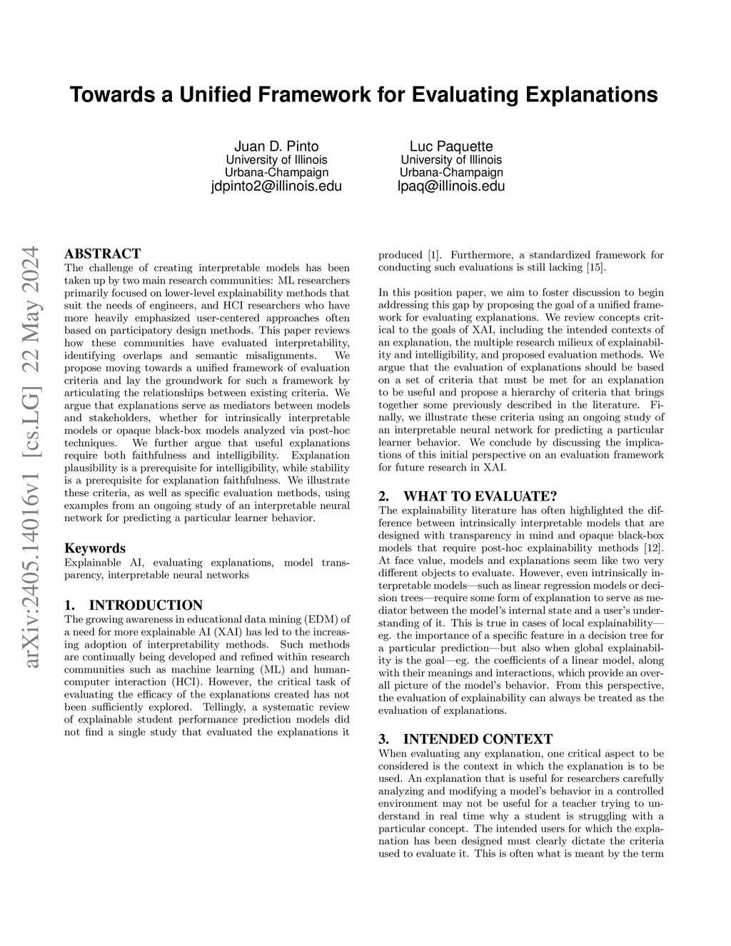 The challenge of creating interpretable models has been taken up by two main research communities: ML researchers primarily focused on lower-level explainability methods that suit the needs of engineers, and HCI researchers who have more heavily emphasized user-centered approaches often based on participatory design methods. This paper reviews how these communities have evaluated interpretability, identifying overlaps and semantic misalignments. We propose moving towards a unified framework of evaluation criteria and lay the groundwork for such a framework by articulating the relationships between existing criteria. We argue that explanations serve as mediators between models and stakeholders, whether for intrinsically interpretable models or opaque black-box models analyzed via post-hoc techniques. We further argue that useful explanations require both faithfulness and intelligibility. Explanation plausibility is a prerequisite for intelligibility, while stability is a prerequisite for explanation faithfulness. We illustrate these criteria, as well as specific evaluation methods, using examples from an ongoing study of an interpretable neural network for predicting a particular learner behavior.