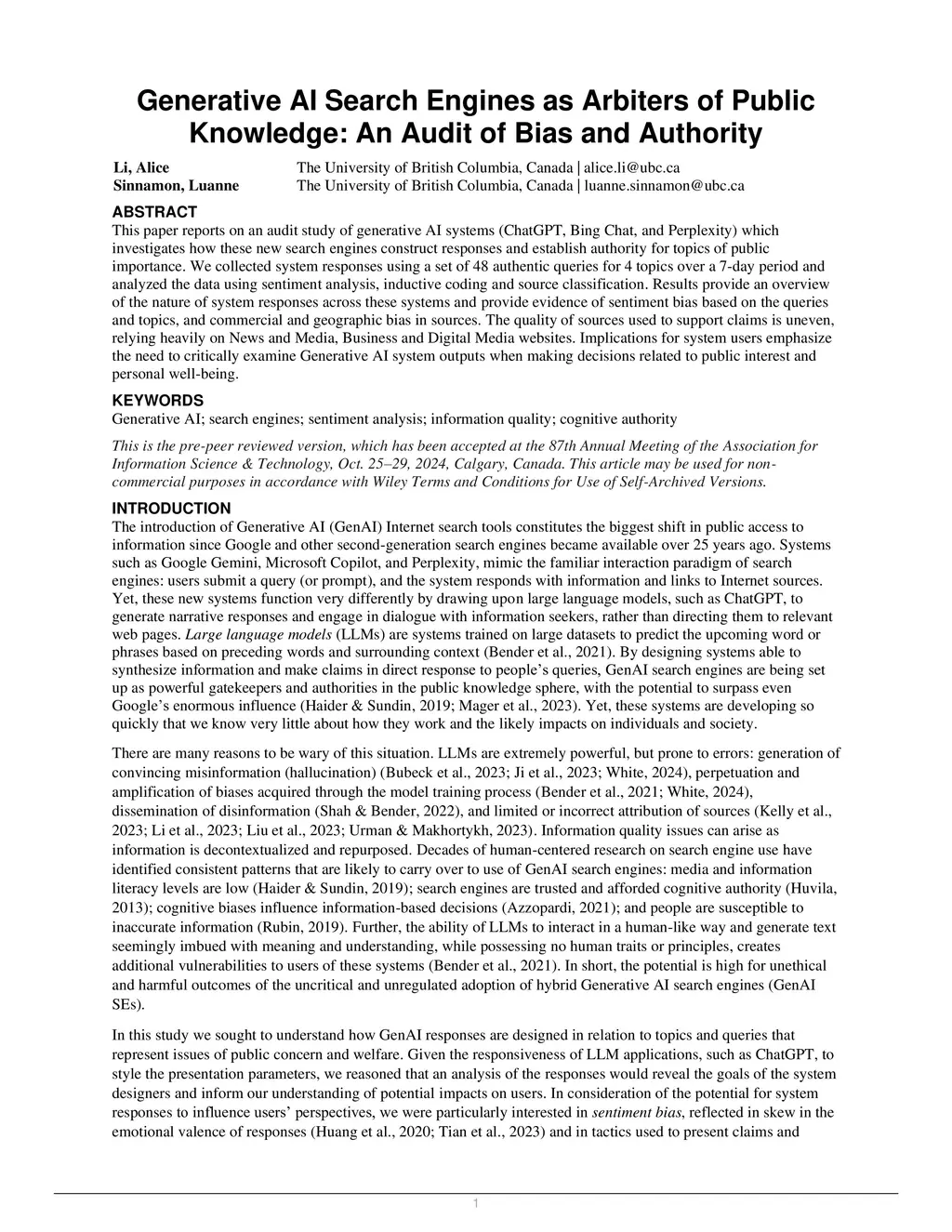 This paper reports on an audit study of generative AI systems (ChatGPT, Bing Chat, and Perplexity) which investigates how these new search engines construct responses and establish authority for topics of public importance. We collected system responses using a set of 48 authentic queries for 4 topics over a 7-day period and analyzed the data using sentiment analysis, inductive coding and source classification. Results provide an overview of the nature of system responses across these systems and provide evidence of sentiment bias based on the queries and topics, and commercial and geographic bias in sources. The quality of sources used to support claims is uneven, relying heavily on News and Media, Business and Digital Media websites. Implications for system users emphasize the need to critically examine Generative AI system outputs when making decisions related to public interest and personal well-being.