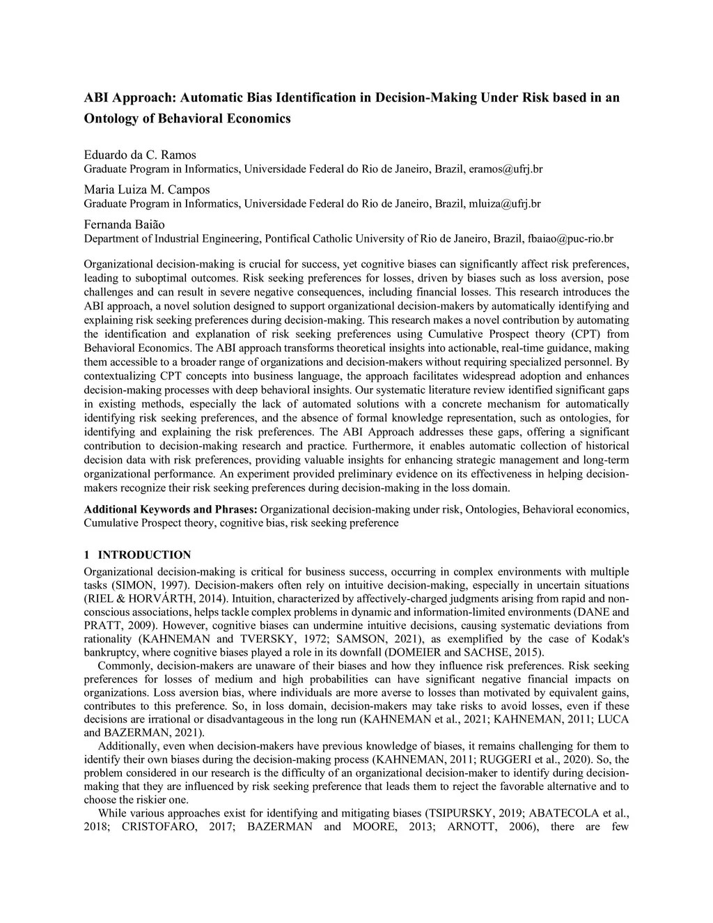 Organizational decision-making is crucial for success, yet cognitive biases can significantly affect risk preferences, leading to suboptimal outcomes. Risk seeking preferences for losses, driven by biases such as loss aversion, pose challenges and can result in severe negative consequences, including financial losses. This research introduces the ABI approach, a novel solution designed to support organizational decision-makers by automatically identifying and explaining risk seeking preferences during decision-making. This research makes a novel contribution by automating the identification and explanation of risk seeking preferences using Cumulative Prospect theory (CPT) from Behavioral Economics. The ABI approach transforms theoretical insights into actionable, real-time guidance, making them accessible to a broader range of organizations and decision-makers without requiring specialized personnel. By contextualizing CPT concepts into business language, the approach facilitates widespread adoption and enhances decision-making processes with deep behavioral insights. Our systematic literature review identified significant gaps in existing methods, especially the lack of automated solutions with a concrete mechanism for automatically identifying risk seeking preferences, and the absence of formal knowledge representation, such as ontologies, for identifying and explaining the risk preferences. The ABI Approach addresses these gaps, offering a significant contribution to decision-making research and practice. Furthermore, it enables automatic collection of historical decision data with risk preferences, providing valuable insights for enhancing strategic management and long-term organizational performance. An experiment provided preliminary evidence on its effectiveness in helping decision-makers recognize their risk seeking preferences during decision-making in the loss domain.