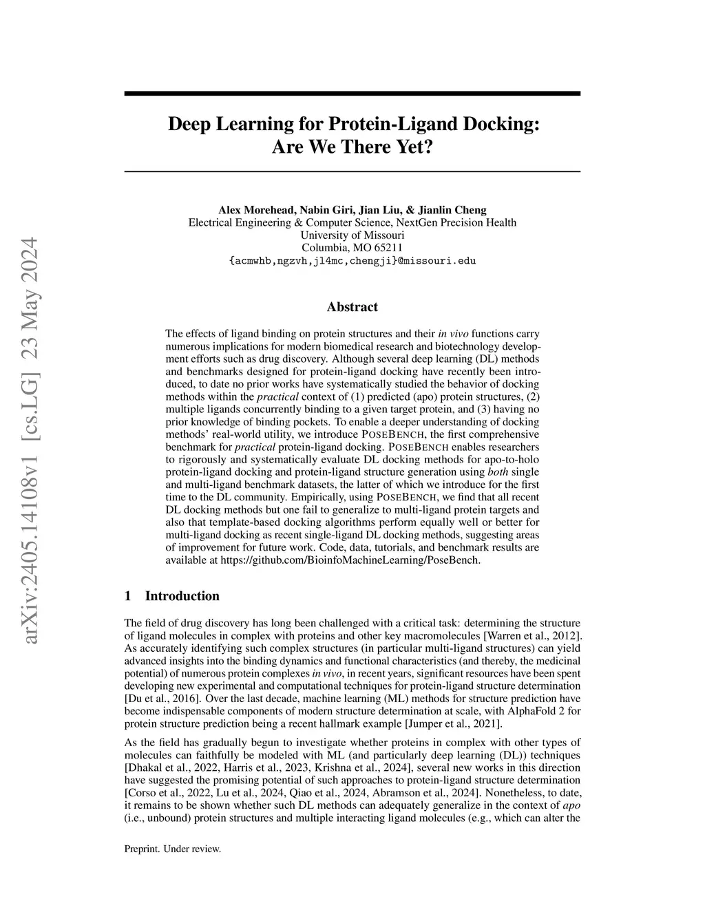 The effects of ligand binding on protein structures and their in vivo functions carry numerous implications for modern biomedical research and biotechnology development efforts such as drug discovery. Although several deep learning (DL) methods and benchmarks designed for protein-ligand docking have recently been introduced, to date no prior works have systematically studied the behavior of the latest docking and structure prediction methods within the broadly applicable context of (1) using predicted (apo) protein structures for docking (e.g., for applicability to new proteins); (2) binding multiple (cofactor) ligands concurrently to a given target protein (e.g., for enzyme design); and (3) having no prior knowledge of binding pockets (e.g., for generalization to unknown pockets). To enable a deeper understanding of docking methods' real-world utility, we introduce PoseBench, the first comprehensive benchmark for broadly applicable protein-ligand docking. PoseBench enables researchers to rigorously and systematically evaluate DL methods for apo-to-holo protein-ligand docking and protein-ligand structure prediction using both primary ligand and multi-ligand benchmark datasets, the latter of which we introduce for the first time to the DL community. Empirically, using PoseBench, we find that (1) DL co-folding methods generally outperform comparable conventional and DL docking baselines, yet popular methods such as AlphaFold 3 are still challenged by prediction targets with novel protein sequences; (2) certain DL co-folding methods are highly sensitive to their input multiple sequence alignments, while others are not; and (3) DL methods struggle to strike a balance between structural accuracy and chemical specificity when predicting novel or multi-ligand protein targets. Code, data, tutorials, and benchmark results are available atthis https URL.