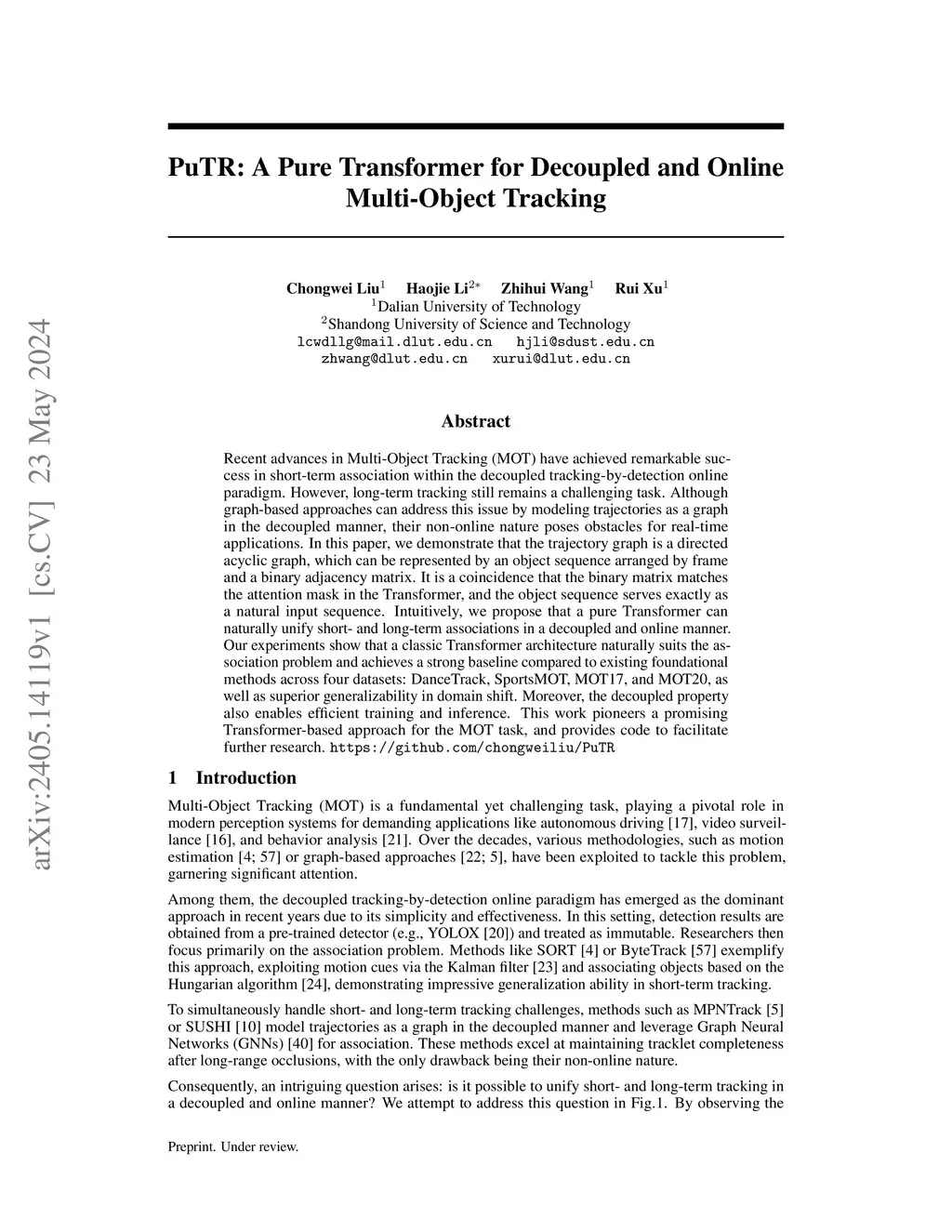 Recent advances in Multi-Object Tracking (MOT) have demonstrated significant success in short-term association within the separated tracking-by-detection online paradigm. However, long-term tracking remains challenging. While graph-based approaches address this by modeling trajectories as global graphs, these methods are unsuitable for real-time applications due to their non-online nature. In this paper, we review the concept of trajectory graphs and propose a novel perspective by representing them as directed acyclic graphs. This representation can be described using frame-ordered object sequences and binary adjacency matrices. We observe that this structure naturally aligns with Transformer attention mechanisms, enabling us to model the association problem using a classic Transformer architecture. Based on this insight, we introduce a concise Pure Transformer (PuTR) to validate the effectiveness of Transformer in unifying short- and long-term tracking for separated online MOT. Extensive experiments on four diverse datasets (SportsMOT, DanceTrack, MOT17, and MOT20) demonstrate that PuTR effectively establishes a solid baseline compared to existing foundational online methods while exhibiting superior domain adaptation capabilities. Furthermore, the separated nature enables efficient training and inference, making it suitable for practical applications. Implementation code and trained models are available atthis https URL.