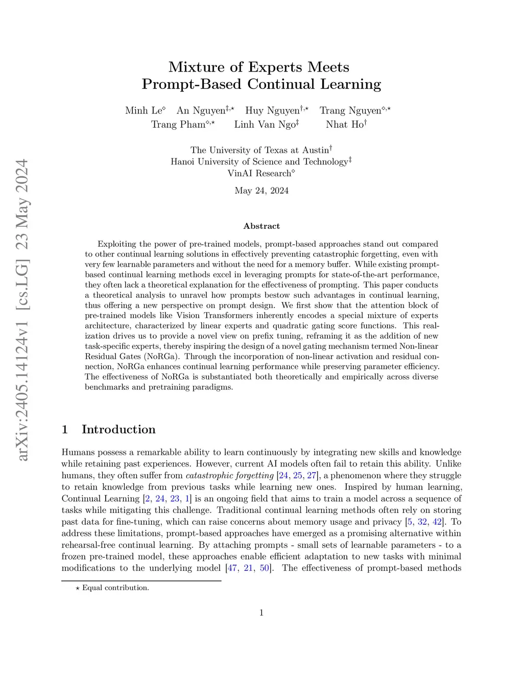 Exploiting the power of pre-trained models, prompt-based approaches stand out compared to other continual learning solutions in effectively preventing catastrophic forgetting, even with very few learnable parameters and without the need for a memory buffer. While existing prompt-based continual learning methods excel in leveraging prompts for state-of-the-art performance, they often lack a theoretical explanation for the effectiveness of prompting. This paper conducts a theoretical analysis to unravel how prompts bestow such advantages in continual learning, thus offering a new perspective on prompt design. We first show that the attention block of pre-trained models like Vision Transformers inherently encodes a special mixture of experts architecture, characterized by linear experts and quadratic gating score functions. This realization drives us to provide a novel view on prefix tuning, reframing it as the addition of new task-specific experts, thereby inspiring the design of a novel gating mechanism termed Non-linear Residual Gates (NoRGa). Through the incorporation of non-linear activation and residual connection, NoRGa enhances continual learning performance while preserving parameter efficiency. The effectiveness of NoRGa is substantiated both theoretically and empirically across diverse benchmarks and pretraining paradigms. Our code is publicly available atthis https URL
