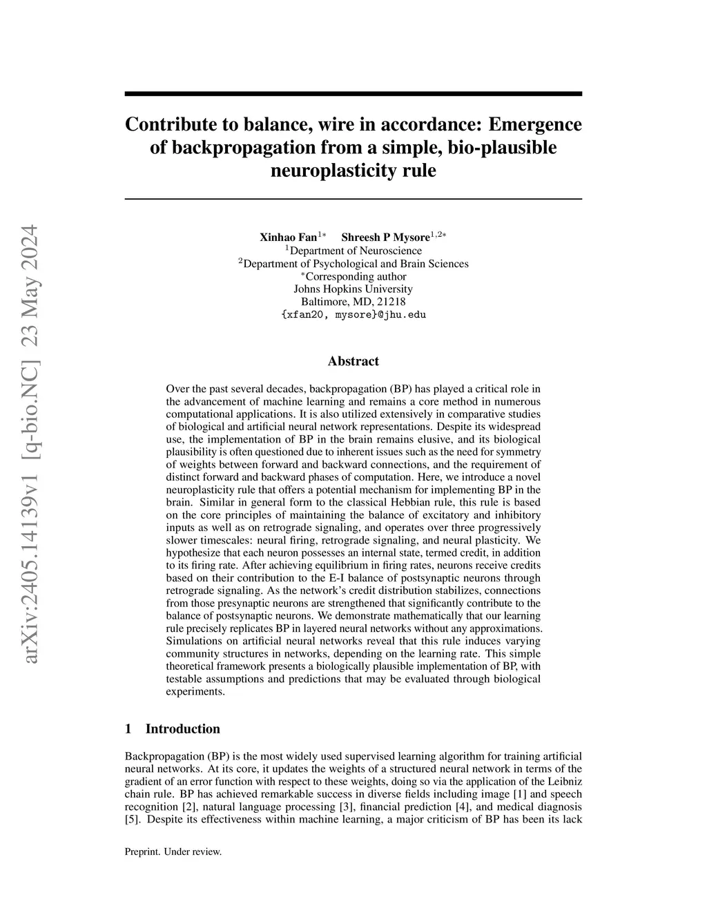 Backpropagation (BP) has been pivotal in advancing machine learning and remains essential in computational applications and comparative studies of biological and artificial neural networks. Despite its widespread use, the implementation of BP in the brain remains elusive, and its biological plausibility is often questioned due to inherent issues such as the need for symmetry of weights between forward and backward connections, and the requirement of distinct forward and backward phases of computation. Here, we introduce a novel neuroplasticity rule that offers a potential mechanism for implementing BP in the brain. Similar in general form to the classical Hebbian rule, this rule is based on the core principles of maintaining the balance of excitatory and inhibitory inputs as well as on retrograde signaling, and operates over three progressively slower timescales: neural firing, retrograde signaling, and neural plasticity. We hypothesize that each neuron possesses an internal state, termed credit, in addition to its firing rate. After achieving equilibrium in firing rates, neurons receive credits based on their contribution to the E-I balance of postsynaptic neurons through retrograde signaling. As the network's credit distribution stabilizes, connections from those presynaptic neurons are strengthened that significantly contribute to the balance of postsynaptic neurons. We demonstrate mathematically that our learning rule precisely replicates BP in layered neural networks without any approximations. Simulations on artificial neural networks reveal that this rule induces varying community structures in networks, depending on the learning rate. This simple theoretical framework presents a biologically plausible implementation of BP, with testable assumptions and predictions that may be evaluated through biological experiments.