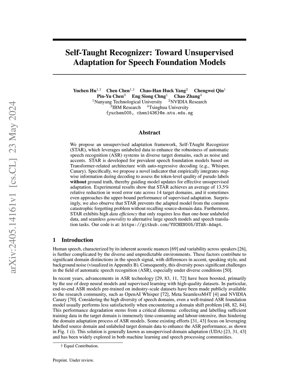 We propose an unsupervised adaptation framework, Self-TAught Recognizer (STAR), which leverages unlabeled data to enhance the robustness of automatic speech recognition (ASR) systems in diverse target domains, such as noise and accents. STAR is developed for prevalent speech foundation models based on Transformer-related architecture with auto-regressive decoding (e.g., Whisper, Canary). Specifically, we propose a novel indicator that empirically integrates step-wise information during decoding to assess the token-level quality of pseudo labels without ground truth, thereby guiding model updates for effective unsupervised adaptation. Experimental results show that STAR achieves an average of 13.5% relative reduction in word error rate across 14 target domains, and it sometimes even approaches the upper-bound performance of supervised adaptation. Surprisingly, we also observe that STAR prevents the adapted model from the common catastrophic forgetting problem without recalling source-domain data. Furthermore, STAR exhibits high data efficiency that only requires less than one-hour unlabeled data, and seamless generality to alternative large speech models and speech translation tasks. Our code aims to open source to the research communities.