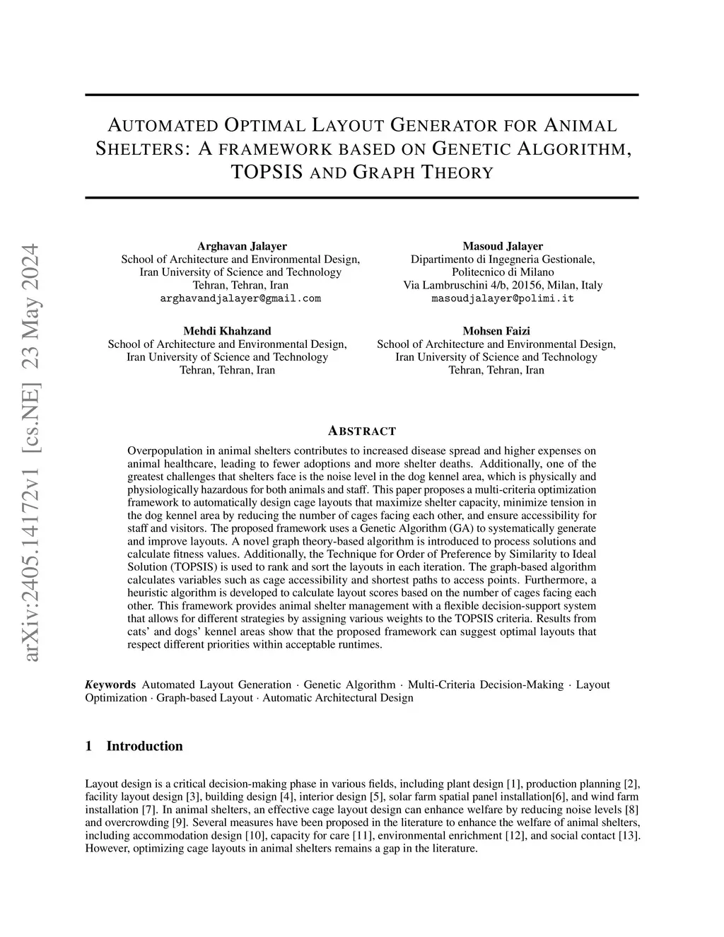 Overpopulation in animal shelters contributes to increased disease spread and higher expenses on animal healthcare, leading to fewer adoptions and more shelter deaths. Additionally, one of the greatest challenges that shelters face is the noise level in the dog kennel area, which is physically and physiologically hazardous for both animals and staff. This paper proposes a multi-criteria optimization framework to automatically design cage layouts that maximize shelter capacity, minimize tension in the dog kennel area by reducing the number of cages facing each other, and ensure accessibility for staff and visitors. The proposed framework uses a Genetic Algorithm (GA) to systematically generate and improve layouts. A novel graph theory-based algorithm is introduced to process solutions and calculate fitness values. Additionally, the Technique for Order of Preference by Similarity to Ideal Solution (TOPSIS) is used to rank and sort the layouts in each iteration. The graph-based algorithm calculates variables such as cage accessibility and shortest paths to access points. Furthermore, a heuristic algorithm is developed to calculate layout scores based on the number of cages facing each other. This framework provides animal shelter management with a flexible decision-support system that allows for different strategies by assigning various weights to the TOPSIS criteria. Results from cats' and dogs' kennel areas show that the proposed framework can suggest optimal layouts that respect different priorities within acceptable runtimes.