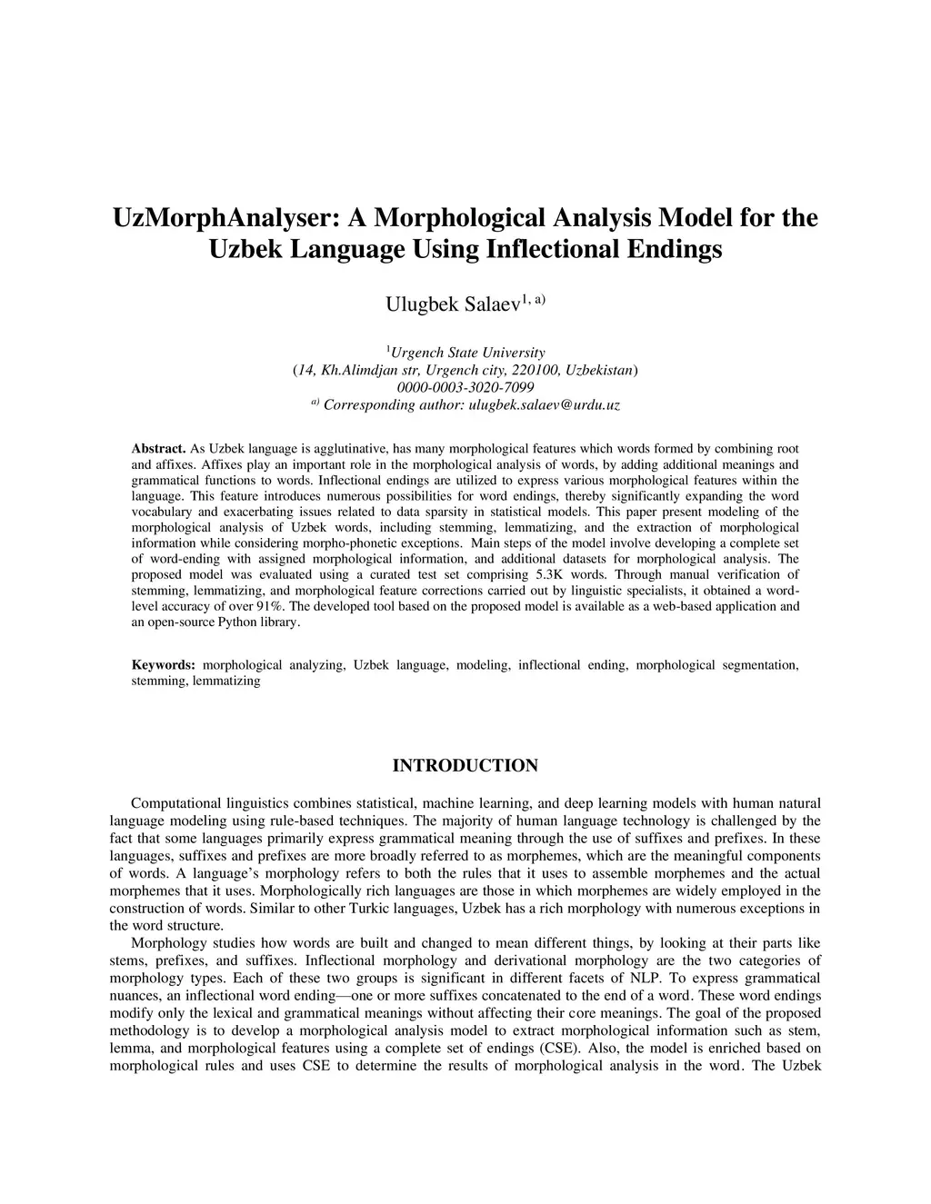UzMorphAnalyser: A Morphological Analysis Model for the Uzbek Language