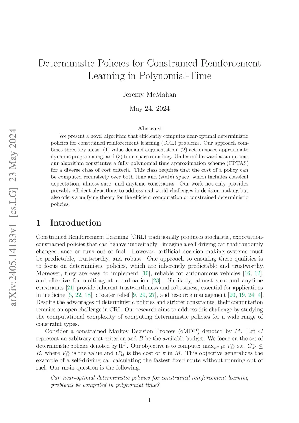We present a novel algorithm that efficiently computes near-optimal deterministic policies for constrained reinforcement learning (CRL) problems. Our approach combines three key ideas: (1) value-demand augmentation, (2) action-space approximate dynamic programming, and (3) time-space rounding. Under mild reward assumptions, our algorithm constitutes a fully polynomial-time approximation scheme (FPTAS) for a diverse class of cost criteria. This class requires that the cost of a policy can be computed recursively over both time and (state) space, which includes classical expectation, almost sure, and anytime constraints. Our work not only provides provably efficient algorithms to address real-world challenges in decision-making but also offers a unifying theory for the efficient computation of constrained deterministic policies.