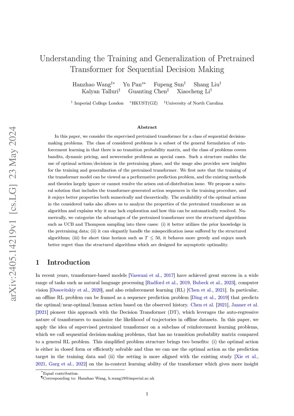 In this paper, we consider the supervised pretrained transformer for a class of sequential decision-making problems. The class of considered problems is a subset of the general formulation of reinforcement learning in that there is no transition probability matrix, and the class of problems covers bandits, dynamic pricing, and newsvendor problems as special cases. Such a structure enables the use of optimal actions/decisions in the pretraining phase, and the usage also provides new insights for the training and generalization of the pretrained transformer. We first note that the training of the transformer model can be viewed as a performative prediction problem, and the existing methods and theories largely ignore or cannot resolve the arisen out-of-distribution issue. We propose a natural solution that includes the transformer-generated action sequences in the training procedure, and it enjoys better properties both numerically and theoretically. The availability of the optimal actions in the considered tasks also allows us to analyze the properties of the pretrained transformer as an algorithm and explains why it may lack exploration and how this can be automatically resolved. Numerically, we categorize the advantages of the pretrained transformer over the structured algorithms such as UCB and Thompson sampling into three cases: (i) it better utilizes the prior knowledge in the pretraining data; (ii) it can elegantly handle the misspecification issue suffered by the structured algorithms; (iii) for short time horizon such as , it behaves more greedy and enjoys much better regret than the structured algorithms which are designed for asymptotic optimality.