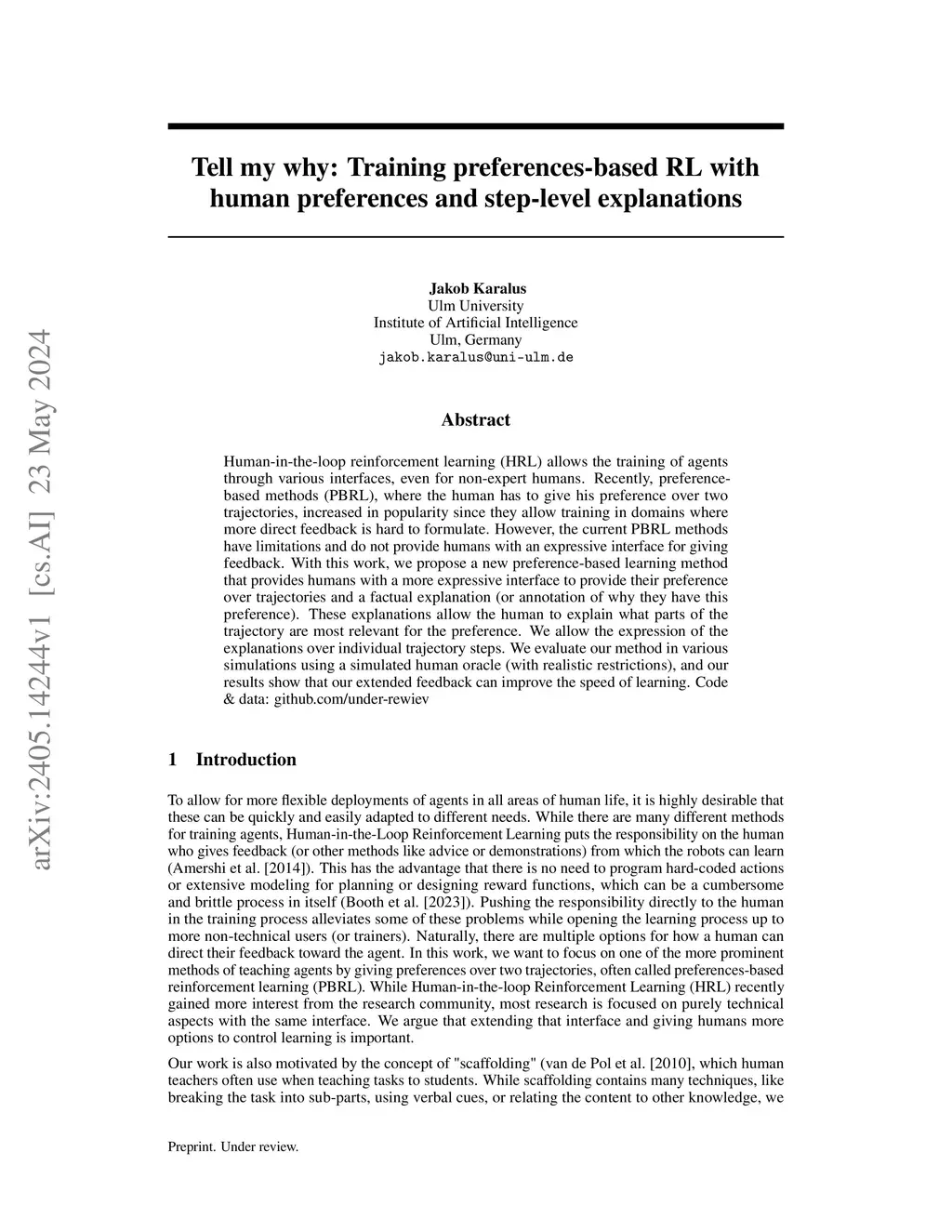 Human-in-the-loop reinforcement learning allows the training of agents through various interfaces, even for non-expert humans. Recently, preference-based methods (PbRL), where the human has to give his preference over two trajectories, increased in popularity since they allow training in domains where more direct feedback is hard to formulate. However, the current PBRL methods have limitations and do not provide humans with an expressive interface for giving feedback. With this work, we propose a new preference-based learning method that provides humans with a more expressive interface to provide their preference over trajectories and a factual explanation (or annotation of why they have this preference). These explanations allow the human to explain what parts of the trajectory are most relevant for the preference. We allow the expression of the explanations over individual trajectory steps. We evaluate our method in various simulations using a simulated human oracle (with realistic restrictions), and our results show that our extended feedback can improve the speed of learning.