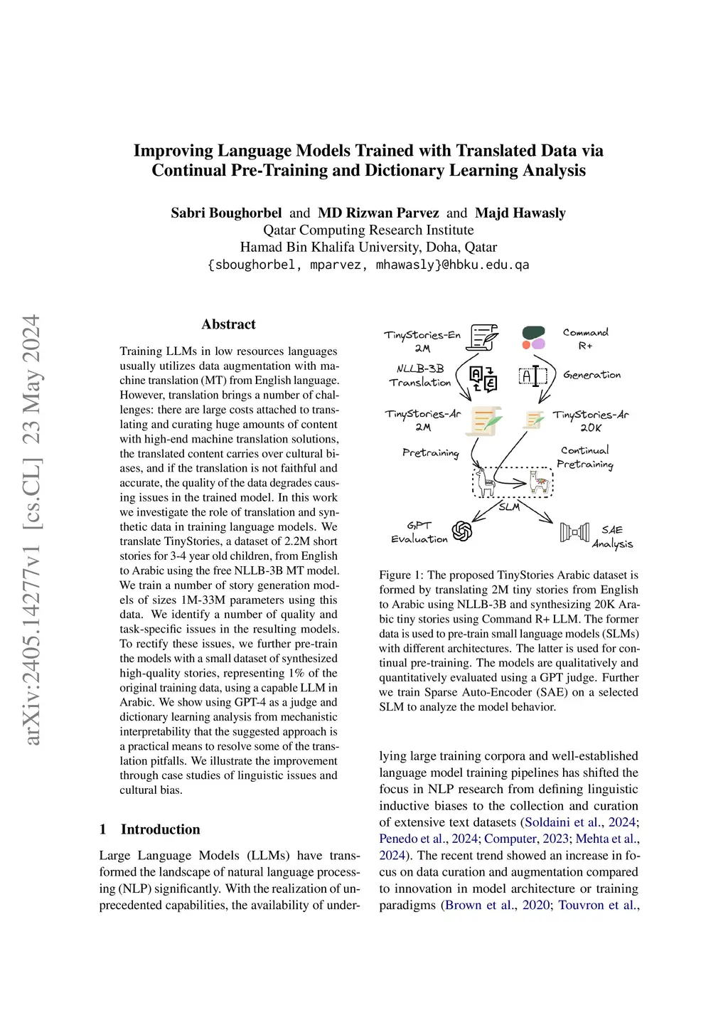 Training LLMs in low resources languages usually utilizes data augmentation with machine translation (MT) from English language. However, translation brings a number of challenges: there are large costs attached to translating and curating huge amounts of content with high-end machine translation solutions, the translated content carries over cultural biases, and if the translation is not faithful and accurate, the quality of the data degrades causing issues in the trained model. In this work we investigate the role of translation and synthetic data in training language models. We translate TinyStories, a dataset of 2.2M short stories for 3-4 year old children, from English to Arabic using the free NLLB-3B MT model. We train a number of story generation models of sizes 1M-33M parameters using this data. We identify a number of quality and task-specific issues in the resulting models. To rectify these issues, we further pre-train the models with a small dataset of synthesized high-quality stories, representing 1\% of the original training data, using a capable LLM in Arabic. We show using GPT-4 as a judge and dictionary learning analysis from mechanistic interpretability that the suggested approach is a practical means to resolve some of the translation pitfalls. We illustrate the improvement through case studies of linguistic issues and cultural bias.