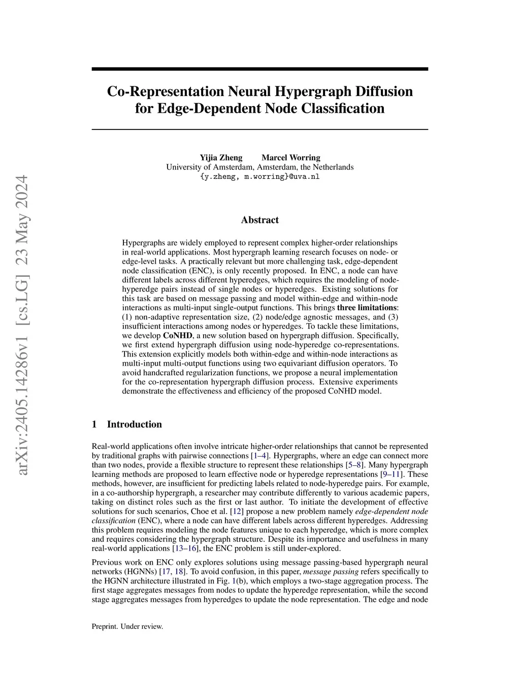 Hypergraphs are widely being employed to represent complex higher-order relations in real-world applications. Most existing research on hypergraph learning focuses on node-level or edge-level tasks. A practically relevant and more challenging task, edge-dependent node classification (ENC), is still under-explored. In ENC, a node can have different labels across different hyperedges, which requires the modeling of node features unique to each hyperedge. The state-of-the-art ENC solution, WHATsNet, only outputs single node and edge representations, leading to the limitations of \textbf{entangled edge-specific features} and \textbf{non-adaptive representation sizes} when applied to ENC. Additionally, WHATsNet suffers from the common \textbf{oversmoothing issue} in most HGNNs. To address these limitations, we propose \textbf{CoNHD}, a novel HGNN architecture specifically designed to model edge-specific features for ENC. Instead of learning separate representations for nodes and edges, CoNHD reformulates within-edge and within-node interactions as a hypergraph diffusion process over node-edge co-representations. We develop a neural implementation of the proposed diffusion process, leveraging equivariant networks as diffusion operators to effectively learn the diffusion dynamics from data. Extensive experiments demonstrate that CoNHD achieves the best performance across all benchmark ENC datasets and several downstream tasks without sacrificing efficiency. Our implementation is available atthis https URL.