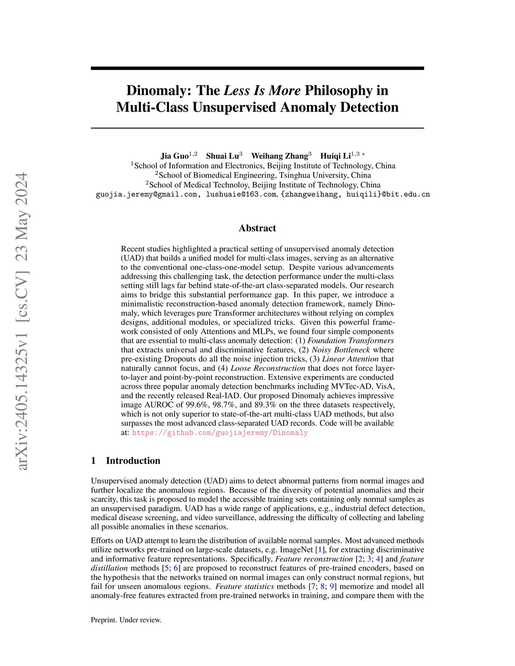 Recent studies highlighted a practical setting of unsupervised anomaly detection (UAD) that builds a unified model for multi-class images. Despite various advancements addressing this challenging task, the detection performance under the multi-class setting still lags far behind state-of-the-art class-separated models. Our research aims to bridge this substantial performance gap. In this paper, we introduce a minimalistic reconstruction-based anomaly detection framework, namely Dinomaly, which leverages pure Transformer architectures without relying on complex designs, additional modules, or specialized tricks. Given this powerful framework consisted of only Attentions and MLPs, we found four simple components that are essential to multi-class anomaly detection: (1) Foundation Transformers that extracts universal and discriminative features, (2) Noisy Bottleneck where pre-existing Dropouts do all the noise injection tricks, (3) Linear Attention that naturally cannot focus, and (4) Loose Reconstruction that does not force layer-to-layer and point-by-point reconstruction. Extensive experiments are conducted across popular anomaly detection benchmarks including MVTec-AD, VisA, and Real-IAD. Our proposed Dinomaly achieves impressive image-level AUROC of 99.6%, 98.7%, and 89.3% on the three datasets respectively, which is not only superior to state-of-the-art multi-class UAD methods, but also achieves the most advanced class-separated UAD records.