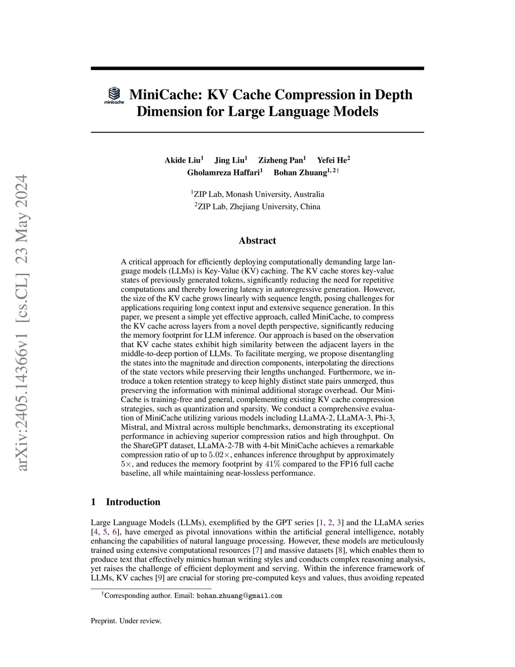 A critical approach for efficiently deploying computationally demanding large language models (LLMs) is Key-Value (KV) caching. The KV cache stores key-value states of previously generated tokens, significantly reducing the need for repetitive computations and thereby lowering latency in autoregressive generation. However, the size of the KV cache grows linearly with sequence length, posing challenges for applications requiring long context input and extensive sequence generation. In this paper, we present a simple yet effective approach, called MiniCache, to compress the KV cache across layers from a novel depth perspective, significantly reducing the memory footprint for LLM inference. Our approach is based on the observation that KV cache states exhibit high similarity between the adjacent layers in the middle-to-deep portion of LLMs. To facilitate merging, we propose disentangling the states into the magnitude and direction components, interpolating the directions of the state vectors while preserving their lengths unchanged. Furthermore, we introduce a token retention strategy to keep highly distinct state pairs unmerged, thus preserving the information with minimal additional storage overhead. Our MiniCache is training-free and general, complementing existing KV cache compression strategies, such as quantization and sparsity. We conduct a comprehensive evaluation of MiniCache utilizing various models including LLaMA-2, LLaMA-3, Phi-3, Mistral, and Mixtral across multiple benchmarks, demonstrating its exceptional performance in achieving superior compression ratios and high throughput. On the ShareGPT dataset, LLaMA-2-7B with 4-bit MiniCache achieves a remarkable compression ratio of up to 5.02x, enhances inference throughput by approximately 5x, and reduces the memory footprint by 41% compared to the FP16 full cache baseline, all while maintaining near-lossless performance.