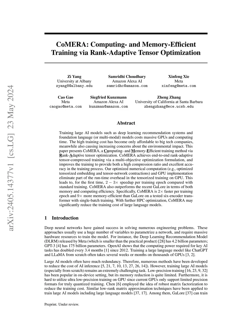 Training large AI models such as deep learning recommendation systems and foundation language (or multi-modal) models costs massive GPUs and computing time. The high training cost has become only affordable to big tech companies, meanwhile also causing increasing concerns about the environmental impact. This paper presents CoMERA, a Computing- and Memory-Efficient training method via Rank-Adaptive tensor optimization. CoMERA achieves end-to-end rank-adaptive tensor-compressed training via a multi-objective optimization formulation, and improves the training to provide both a high compression ratio and excellent accuracy in the training process. Our optimized numerical computation (e.g., optimized tensorized embedding and tensor-vector contractions) and GPU implementation eliminate part of the run-time overhead in the tensorized training on GPU. This leads to, for the first time, speedup per training epoch compared with standard training. CoMERA also outperforms the recent GaLore in terms of both memory and computing efficiency. Specifically, CoMERA is faster per training epoch and more memory-efficient than GaLore on a tested six-encoder transformer with single-batch training. With further HPC optimization, CoMERA may significantly reduce the training cost of large language models.