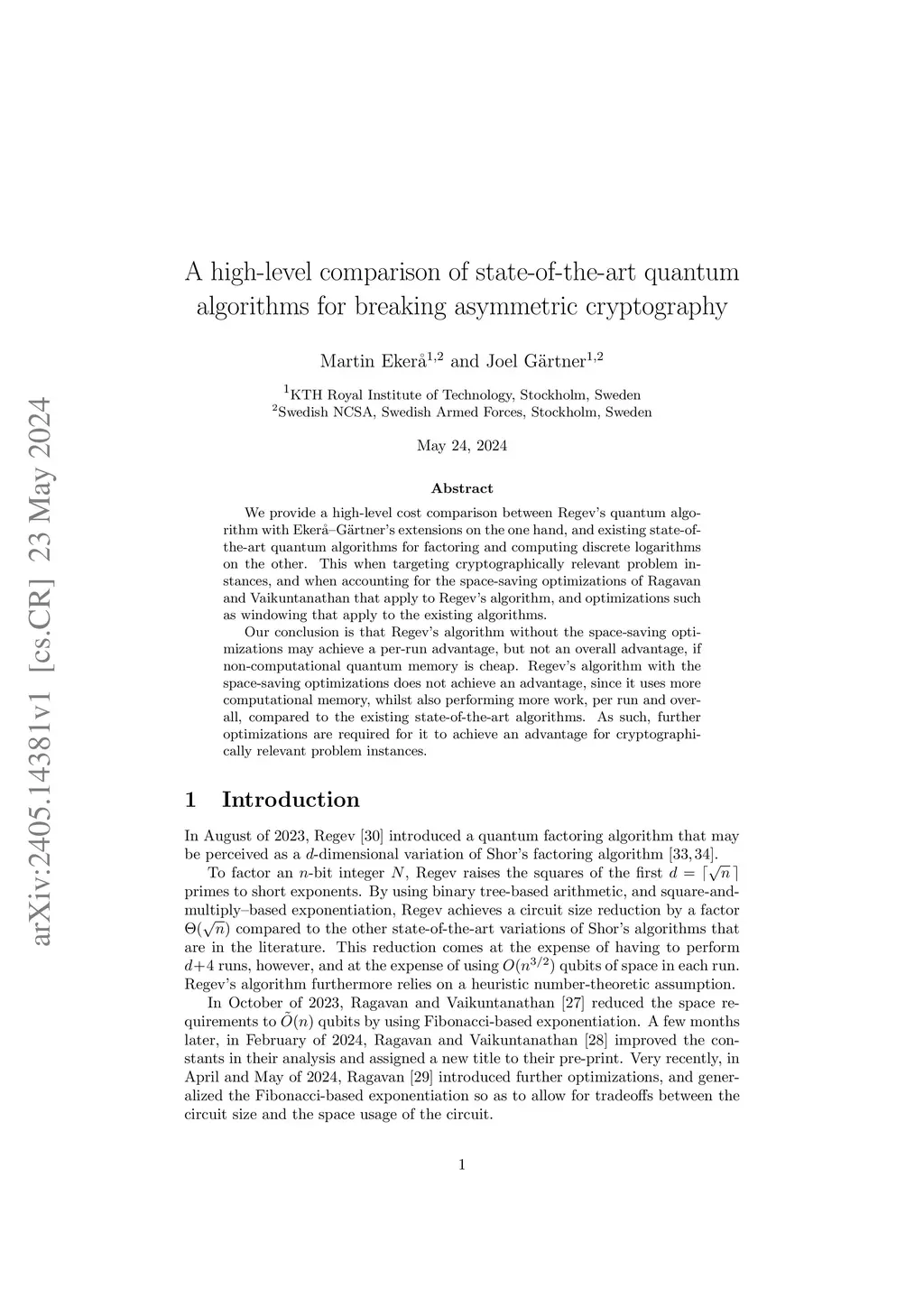 We provide a high-level cost comparison between Regev's quantum algorithm with Eker{\aa}-G\"artner's extensions on the one hand, and existing state-of-the-art quantum algorithms for factoring and computing discrete logarithms on the other. This when targeting cryptographically relevant problem instances, and when accounting for the space-saving optimizations of Ragavan and Vaikuntanathan that apply to Regev's algorithm, and optimizations such as windowing that apply to the existing algorithms. Our conclusion is that Regev's algorithm without the space-saving optimizations may achieve a per-run advantage, but not an overall advantage, if non-computational quantum memory is cheap. Regev's algorithm with the space-saving optimizations does not achieve an advantage, since it uses more computational memory, whilst also performing more work, per run and overall, compared to the existing state-of-the-art algorithms. As such, further optimizations are required for it to achieve an advantage for cryptographically relevant problem instances.