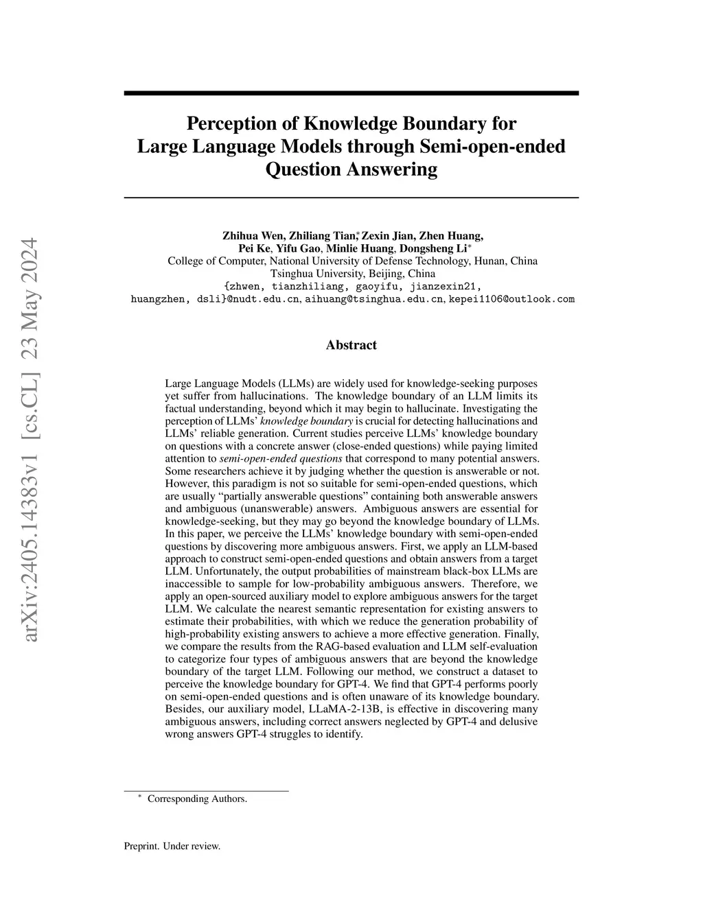 Large Language Models (LLMs) are widely used for knowledge-seeking yet suffer from hallucinations. The knowledge boundary (KB) of an LLM limits its factual understanding, beyond which it may begin to hallucinate. Investigating the perception of LLMs' KB is crucial for detecting hallucinations and LLMs' reliable generation. Current studies perceive LLMs' KB on questions with a concrete answer (close-ended questions) while paying limited attention to semi-open-ended questions (SoeQ) that correspond to many potential answers. Some researchers achieve it by judging whether the question is answerable or not. However, this paradigm is unsuitable for SoeQ, which are usually partially answerable, containing both answerable and ambiguous (unanswerable) answers. Ambiguous answers are essential for knowledge-seeking, but they may go beyond the KB of LLMs. In this paper, we perceive the LLMs' KB with SoeQ by discovering more ambiguous answers. First, we apply an LLM-based approach to construct SoeQ and obtain answers from a target LLM. Unfortunately, the output probabilities of mainstream black-box LLMs are inaccessible to sample for low-probability ambiguous answers. Therefore, we apply an open-sourced auxiliary model to explore ambiguous answers for the target LLM. We calculate the nearest semantic representation for existing answers to estimate their probabilities, with which we reduce the generation probability of high-probability answers to achieve a more effective generation. Finally, we compare the results from the RAG-based evaluation and LLM self-evaluation to categorize four types of ambiguous answers that are beyond the KB of the target LLM. Following our method, we construct a dataset to perceive the KB for GPT-4. We find that GPT-4 performs poorly on SoeQ and is often unaware of its KB. Besides, our auxiliary model, LLaMA-2-13B, is effective in discovering more ambiguous answers.