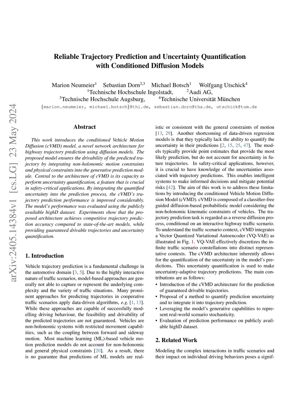 This work introduces the conditioned Vehicle Motion Diffusion (cVMD) model, a novel network architecture for highway trajectory prediction using diffusion models. The proposed model ensures the drivability of the predicted trajectory by integrating non-holonomic motion constraints and physical constraints into the generative prediction module. Central to the architecture of cVMD is its capacity to perform uncertainty quantification, a feature that is crucial in safety-critical applications. By integrating the quantified uncertainty into the prediction process, the cVMD's trajectory prediction performance is improved considerably. The model's performance was evaluated using the publicly available highD dataset. Experiments show that the proposed architecture achieves competitive trajectory prediction accuracy compared to state-of-the-art models, while providing guaranteed drivable trajectories and uncertainty quantification.