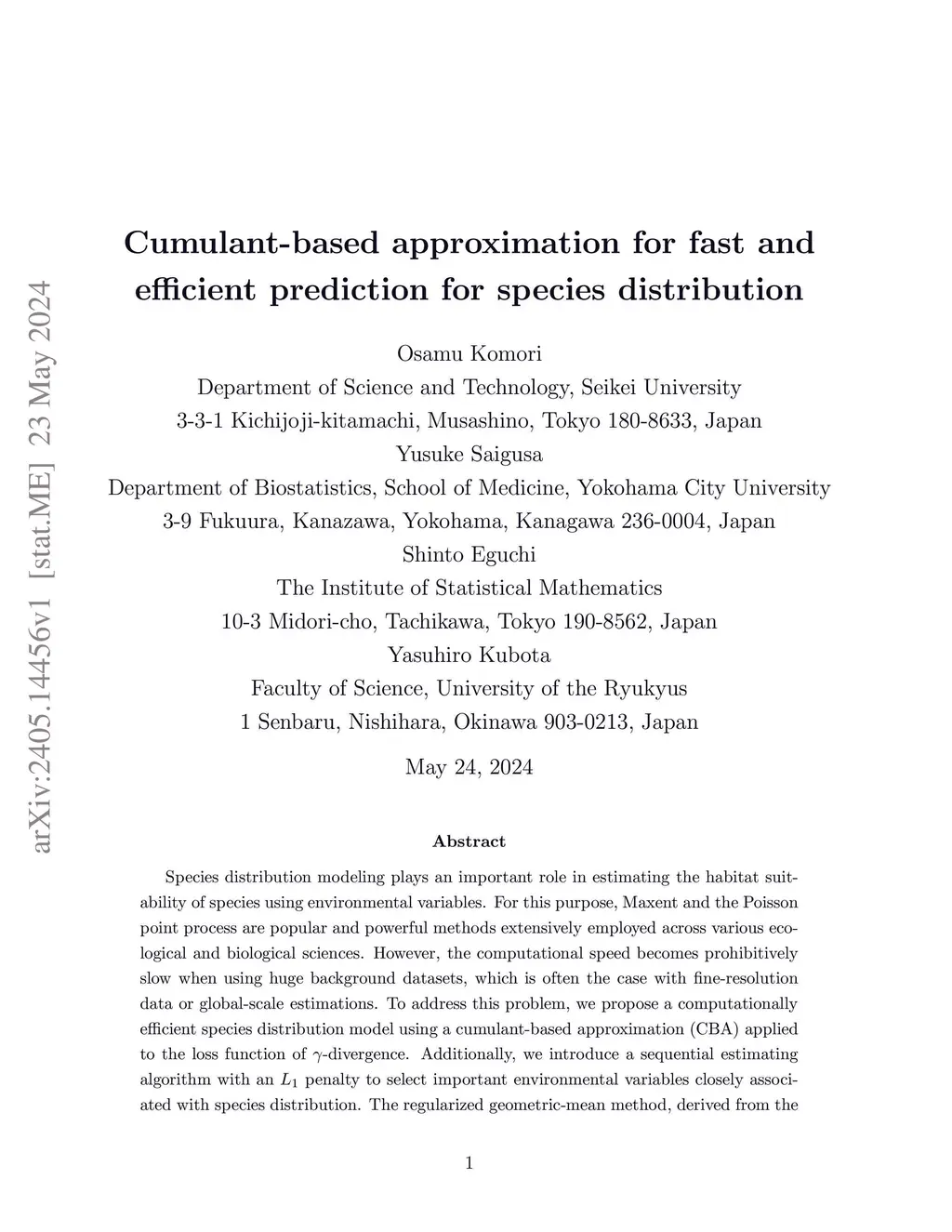 Species distribution modeling plays an important role in estimating the habitat suitability of species using environmental variables. For this purpose, Maxent and the Poisson point process are popular and powerful methods extensively employed across various ecological and biological sciences. However, the computational speed becomes prohibitively slow when using huge background datasets, which is often the case with fine-resolution data or global-scale estimations. To address this problem, we propose a computationally efficient species distribution model using a cumulant-based approximation (CBA) applied to the loss function of -divergence. Additionally, we introduce a sequential estimating algorithm with an penalty to select important environmental variables closely associated with species distribution. The regularized geometric-mean method, derived from the CBA, demonstrates high computational efficiency and estimation accuracy. Moreover, by applying CBA to Maxent, we establish that Maxent and Fisher linear discriminant analysis are equivalent under a normality assumption. This equivalence leads to an highly efficient computational method for estimating species distribution. The effectiveness of our proposed methods is illustrated through simulation studies and by analyzing data on 226 species from the National Centre for Ecological Analysis and Synthesis and 709 Japanese vascular plant species. The computational efficiency of the proposed methods is significantly improved compared to Maxent, while maintaining comparable estimation accuracy. A R package {\tt CBA} is also prepared to provide all programming codes used in simulation studies and real data analysis.