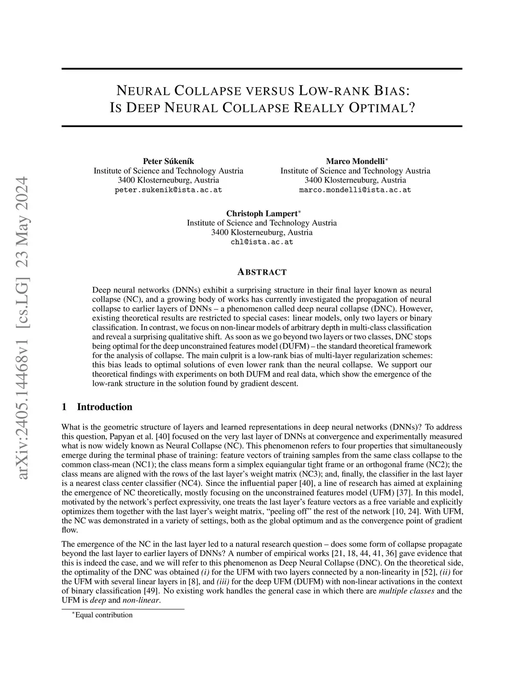 Deep neural networks (DNNs) exhibit a surprising structure in their final layer known as neural collapse (NC), and a growing body of works has currently investigated the propagation of neural collapse to earlier layers of DNNs -- a phenomenon called deep neural collapse (DNC). However, existing theoretical results are restricted to special cases: linear models, only two layers or binary classification. In contrast, we focus on non-linear models of arbitrary depth in multi-class classification and reveal a surprising qualitative shift. As soon as we go beyond two layers or two classes, DNC stops being optimal for the deep unconstrained features model (DUFM) -- the standard theoretical framework for the analysis of collapse. The main culprit is a low-rank bias of multi-layer regularization schemes: this bias leads to optimal solutions of even lower rank than the neural collapse. We support our theoretical findings with experiments on both DUFM and real data, which show the emergence of the low-rank structure in the solution found by gradient descent.