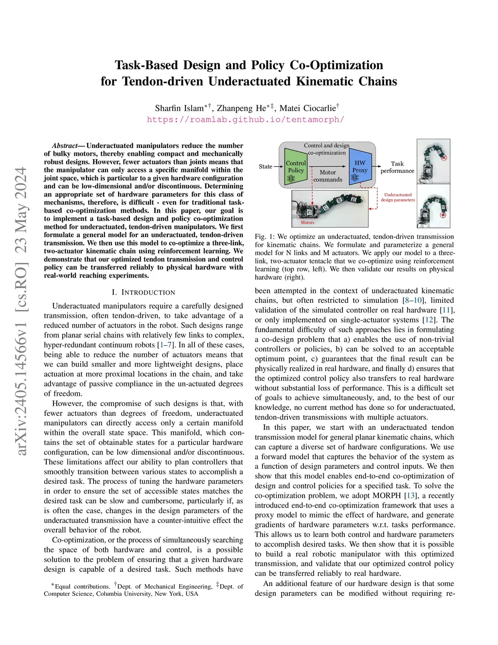 Underactuated manipulators reduce the number of bulky motors, thereby enabling compact and mechanically robust designs. However, fewer actuators than joints means that the manipulator can only access a specific manifold within the joint space, which is particular to a given hardware configuration and can be low-dimensional and/or discontinuous. Determining an appropriate set of hardware parameters for this class of mechanisms, therefore, is difficult - even for traditional task-based co-optimization methods. In this paper, our goal is to implement a task-based design and policy co-optimization method for underactuated, tendon-driven manipulators. We first formulate a general model for an underactuated, tendon-driven transmission. We then use this model to co-optimize a three-link, two-actuator kinematic chain using reinforcement learning. We demonstrate that our optimized tendon transmission and control policy can be transferred reliably to physical hardware with real-world reaching experiments.