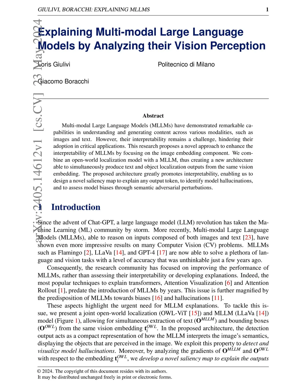 Multi-modal Large Language Models (MLLMs) have demonstrated remarkable capabilities in understanding and generating content across various modalities, such as images and text. However, their interpretability remains a challenge, hindering their adoption in critical applications. This research proposes a novel approach to enhance the interpretability of MLLMs by focusing on the image embedding component. We combine an open-world localization model with a MLLM, thus creating a new architecture able to simultaneously produce text and object localization outputs from the same vision embedding. The proposed architecture greatly promotes interpretability, enabling us to design a novel saliency map to explain any output token, to identify model hallucinations, and to assess model biases through semantic adversarial perturbations.