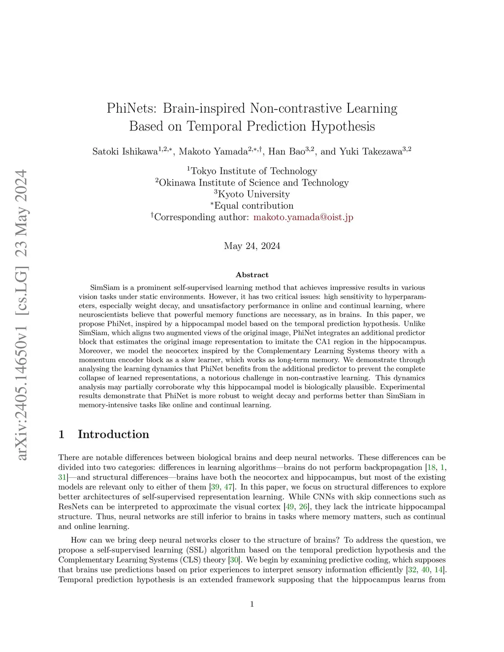 PhiNets: Brain-inspired Non-contrastive Learning Based on Temporal Prediction Hypothesis