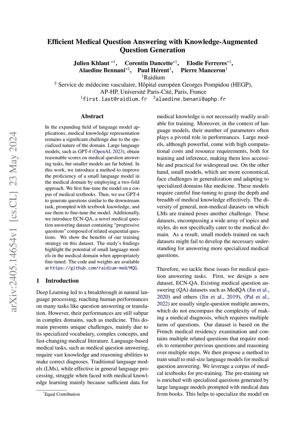 In the expanding field of language model applications, medical knowledge representation remains a significant challenge due to the specialized nature of the domain. Large language models, such as GPT-4, obtain reasonable scores on medical question answering tasks, but smaller models are far behind. In this work, we introduce a method to improve the proficiency of a small language model in the medical domain by employing a two-fold approach. We first fine-tune the model on a corpus of medical textbooks. Then, we use GPT-4 to generate questions similar to the downstream task, prompted with textbook knowledge, and use them to fine-tune the model. Additionally, we introduce ECN-QA, a novel medical question answering dataset containing ``progressive questions'' composed of related sequential questions. We show the benefits of our training strategy on this dataset. The study's findings highlight the potential of small language models in the medical domain when appropriately fine-tuned. The code and weights are available at https://github.com/raidium-med/MQG.
