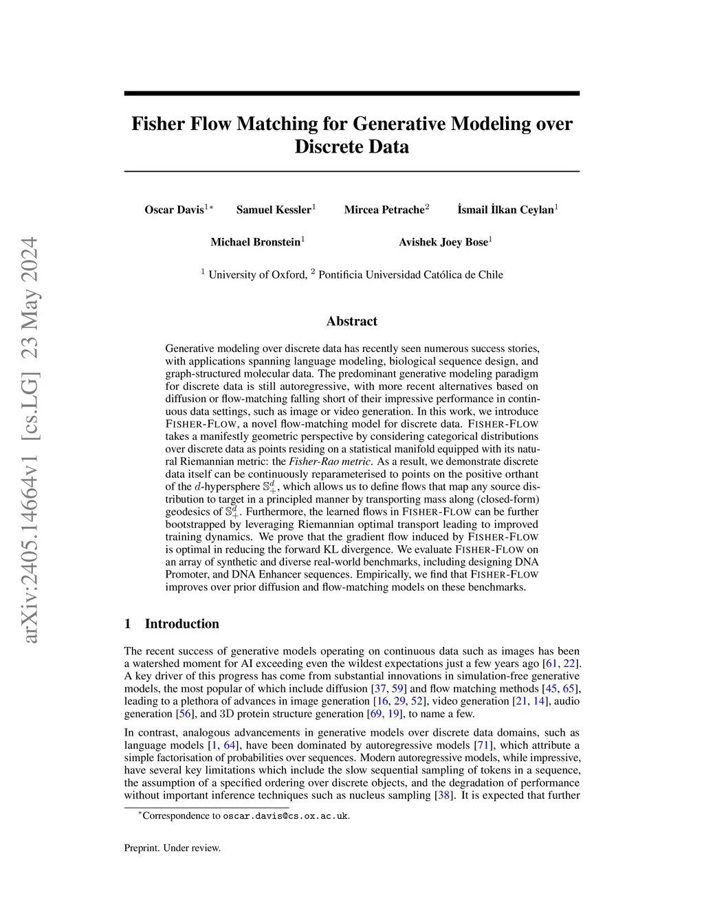 Generative modeling over discrete data has recently seen numerous success stories, with applications spanning language modeling, biological sequence design, and graph-structured molecular data. The predominant generative modeling paradigm for discrete data is still autoregressive, with more recent alternatives based on diffusion or flow-matching falling short of their impressive performance in continuous data settings, such as image or video generation. In this work, we introduce Fisher-Flow, a novel flow-matching model for discrete data. Fisher-Flow takes a manifestly geometric perspective by considering categorical distributions over discrete data as points residing on a statistical manifold equipped with its natural Riemannian metric: the . As a result, we demonstrate discrete data itself can be continuously reparameterised to points on the positive orthant of the -hypersphere , which allows us to define flows that map any source distribution to target in a principled manner by transporting mass along (closed-form) geodesics of . Furthermore, the learned flows in Fisher-Flow can be further bootstrapped by leveraging Riemannian optimal transport leading to improved training dynamics. We prove that the gradient flow induced by Fisher-Flow is optimal in reducing the forward KL divergence. We evaluate Fisher-Flow on an array of synthetic and diverse real-world benchmarks, including designing DNA Promoter, and DNA Enhancer sequences. Empirically, we find that Fisher-Flow improves over prior diffusion and flow-matching models on these benchmarks.