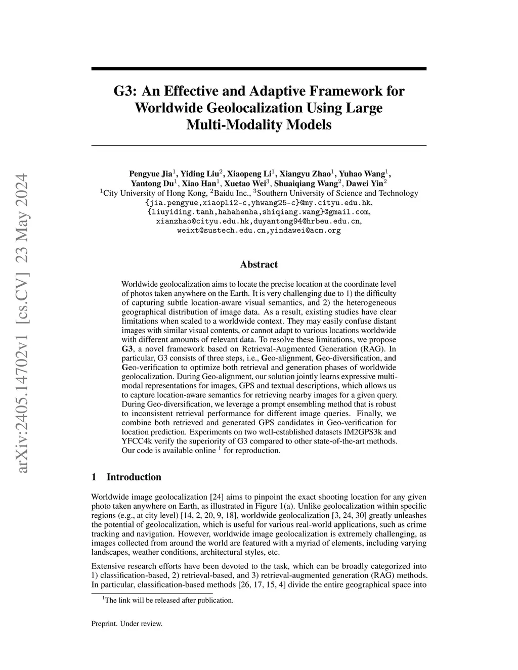 Worldwide geolocalization aims to locate the precise location at the coordinate level of photos taken anywhere on the Earth. It is very challenging due to 1) the difficulty of capturing subtle location-aware visual semantics, and 2) the heterogeneous geographical distribution of image data. As a result, existing studies have clear limitations when scaled to a worldwide context. They may easily confuse distant images with similar visual contents, or cannot adapt to various locations worldwide with different amounts of relevant data. To resolve these limitations, we propose G3, a novel framework based on Retrieval-Augmented Generation (RAG). In particular, G3 consists of three steps, i.e., Geo-alignment, Geo-diversification, and Geo-verification to optimize both retrieval and generation phases of worldwide geolocalization. During Geo-alignment, our solution jointly learns expressive multi-modal representations for images, GPS and textual descriptions, which allows us to capture location-aware semantics for retrieving nearby images for a given query. During Geo-diversification, we leverage a prompt ensembling method that is robust to inconsistent retrieval performance for different image queries. Finally, we combine both retrieved and generated GPS candidates in Geo-verification for location prediction. Experiments on two well-established datasets IM2GPS3k and YFCC4k verify the superiority of G3 compared to other state-of-the-art methods.