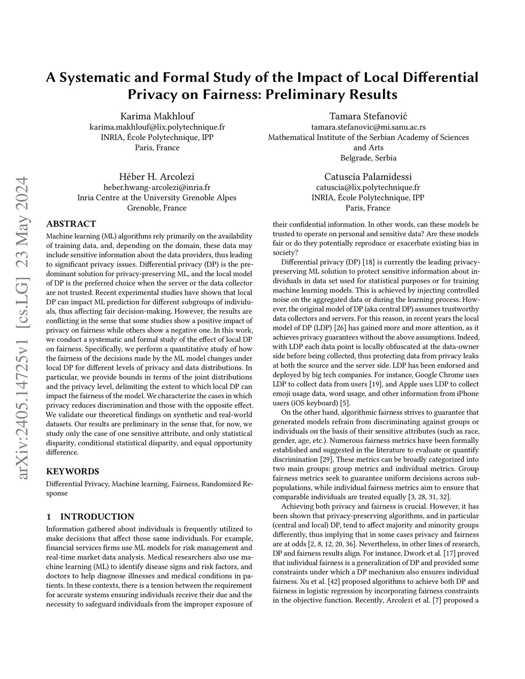 Machine learning (ML) algorithms rely primarily on the availability of training data, and, depending on the domain, these data may include sensitive information about the data providers, thus leading to significant privacy issues. Differential privacy (DP) is the predominant solution for privacy-preserving ML, and the local model of DP is the preferred choice when the server or the data collector are not trusted. Recent experimental studies have shown that local DP can impact ML prediction for different subgroups of individuals, thus affecting fair decision-making. However, the results are conflicting in the sense that some studies show a positive impact of privacy on fairness while others show a negative one. In this work, we conduct a systematic and formal study of the effect of local DP on fairness. Specifically, we perform a quantitative study of how the fairness of the decisions made by the ML model changes under local DP for different levels of privacy and data distributions. In particular, we provide bounds in terms of the joint distributions and the privacy level, delimiting the extent to which local DP can impact the fairness of the model. We characterize the cases in which privacy reduces discrimination and those with the opposite effect. We validate our theoretical findings on synthetic and real-world datasets. Our results are preliminary in the sense that, for now, we study only the case of one sensitive attribute, and only statistical disparity, conditional statistical disparity, and equal opportunity difference.
