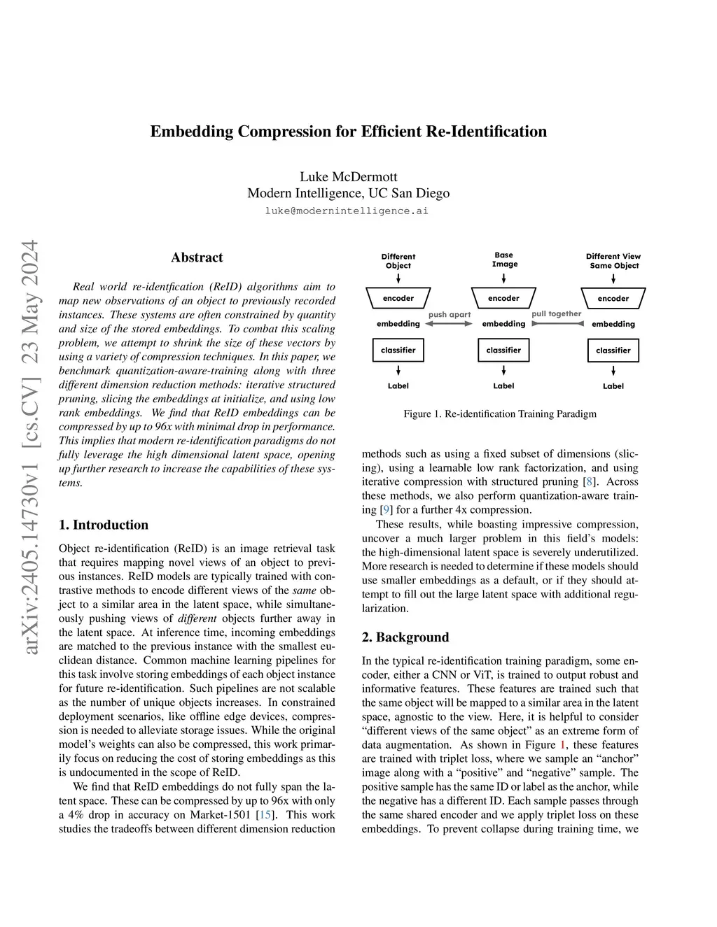 Real world re-identfication (ReID) algorithms aim to map new observations of an object to previously recorded instances. These systems are often constrained by quantity and size of the stored embeddings. To combat this scaling problem, we attempt to shrink the size of these vectors by using a variety of compression techniques. In this paper, we benchmark quantization-aware-training along with three different dimension reduction methods: iterative structured pruning, slicing the embeddings at initialize, and using low rank embeddings. We find that ReID embeddings can be compressed by up to 96x with minimal drop in performance. This implies that modern re-identification paradigms do not fully leverage the high dimensional latent space, opening up further research to increase the capabilities of these systems.
