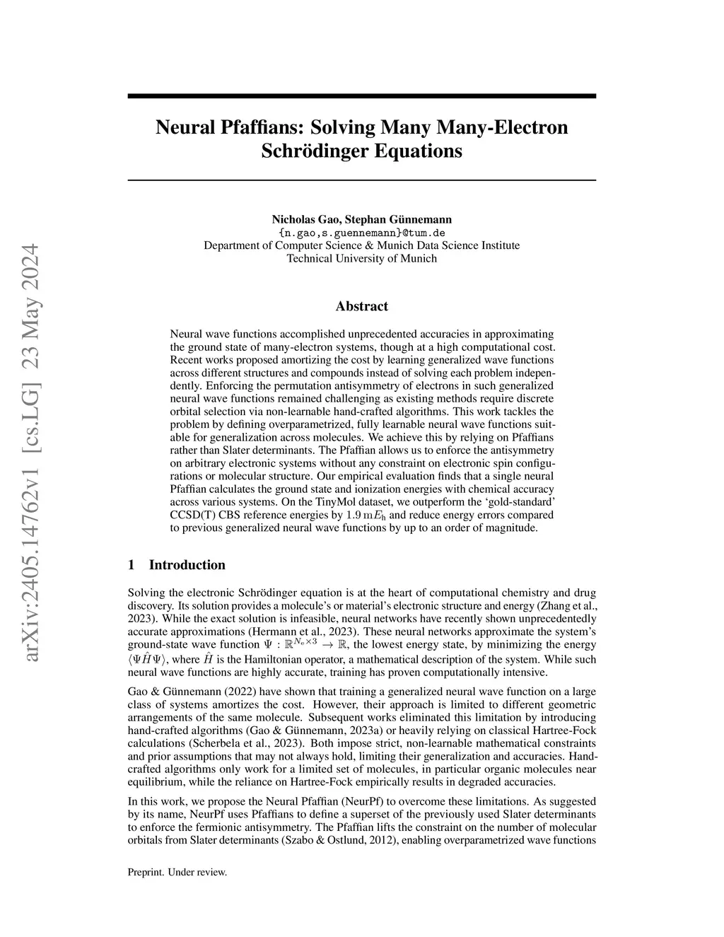 Neural wave functions accomplished unprecedented accuracies in approximating the ground state of many-electron systems, though at a high computational cost. Recent works proposed amortizing the cost by learning generalized wave functions across different structures and compounds instead of solving each problem independently. Enforcing the permutation antisymmetry of electrons in such generalized neural wave functions remained challenging as existing methods require discrete orbital selection via non-learnable hand-crafted algorithms. This work tackles the problem by defining overparametrized, fully learnable neural wave functions suitable for generalization across molecules. We achieve this by relying on Pfaffians rather than Slater determinants. The Pfaffian allows us to enforce the antisymmetry on arbitrary electronic systems without any constraint on electronic spin configurations or molecular structure. Our empirical evaluation finds that a single neural Pfaffian calculates the ground state and ionization energies with chemical accuracy across various systems. On the TinyMol dataset, we outperform the `gold-standard' CCSD(T) CBS reference energies by 1.9m and reduce energy errors compared to previous generalized neural wave functions by up to an order of magnitude.