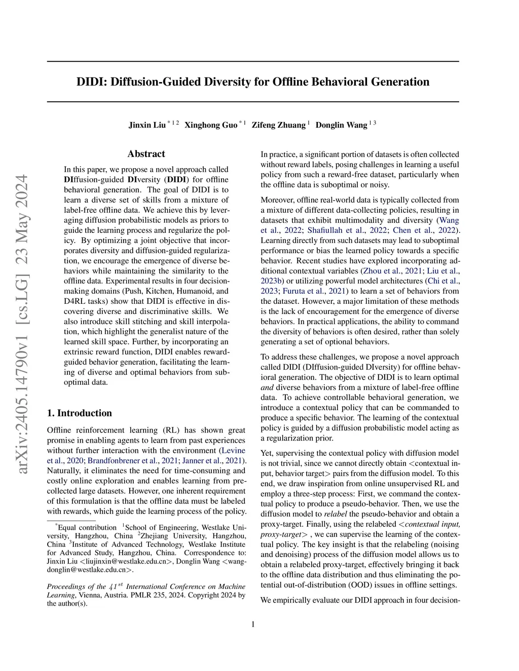 DIDI: Diffusion-Guided Diversity for Offline Behavioral Generation