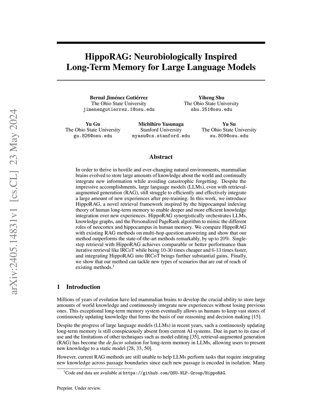 HippoRAG: Neurobiologically Inspired Long-Term Memory for Large Language Models