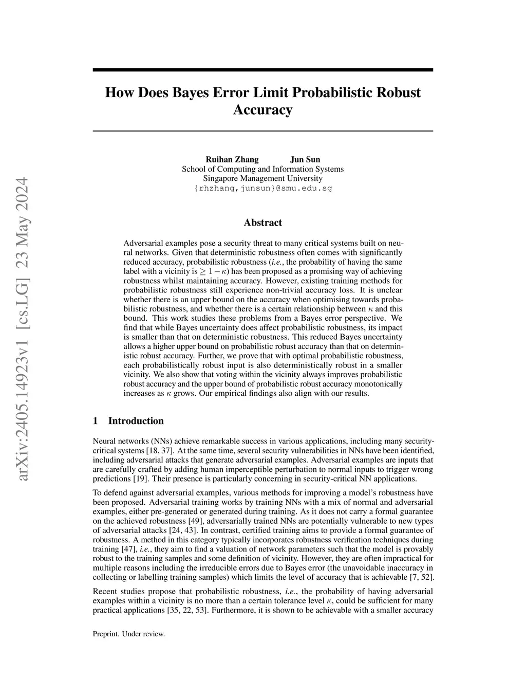 Adversarial examples pose a security threat to many critical systems built on neural networks. Given that deterministic robustness often comes with significantly reduced accuracy, probabilistic robustness (i.e., the probability of having the same label with a vicinity is ) has been proposed as a promising way of achieving robustness whilst maintaining accuracy. However, existing training methods for probabilistic robustness still experience non-trivial accuracy loss. It is unclear whether there is an upper bound on the accuracy when optimising towards probabilistic robustness, and whether there is a certain relationship between and this bound. This work studies these problems from a Bayes error perspective. We find that while Bayes uncertainty does affect probabilistic robustness, its impact is smaller than that on deterministic robustness. This reduced Bayes uncertainty allows a higher upper bound on probabilistic robust accuracy than that on deterministic robust accuracy. Further, we prove that with optimal probabilistic robustness, each probabilistically robust input is also deterministically robust in a smaller vicinity. We also show that voting within the vicinity always improves probabilistic robust accuracy and the upper bound of probabilistic robust accuracy monotonically increases as grows. Our empirical findings also align with our results.