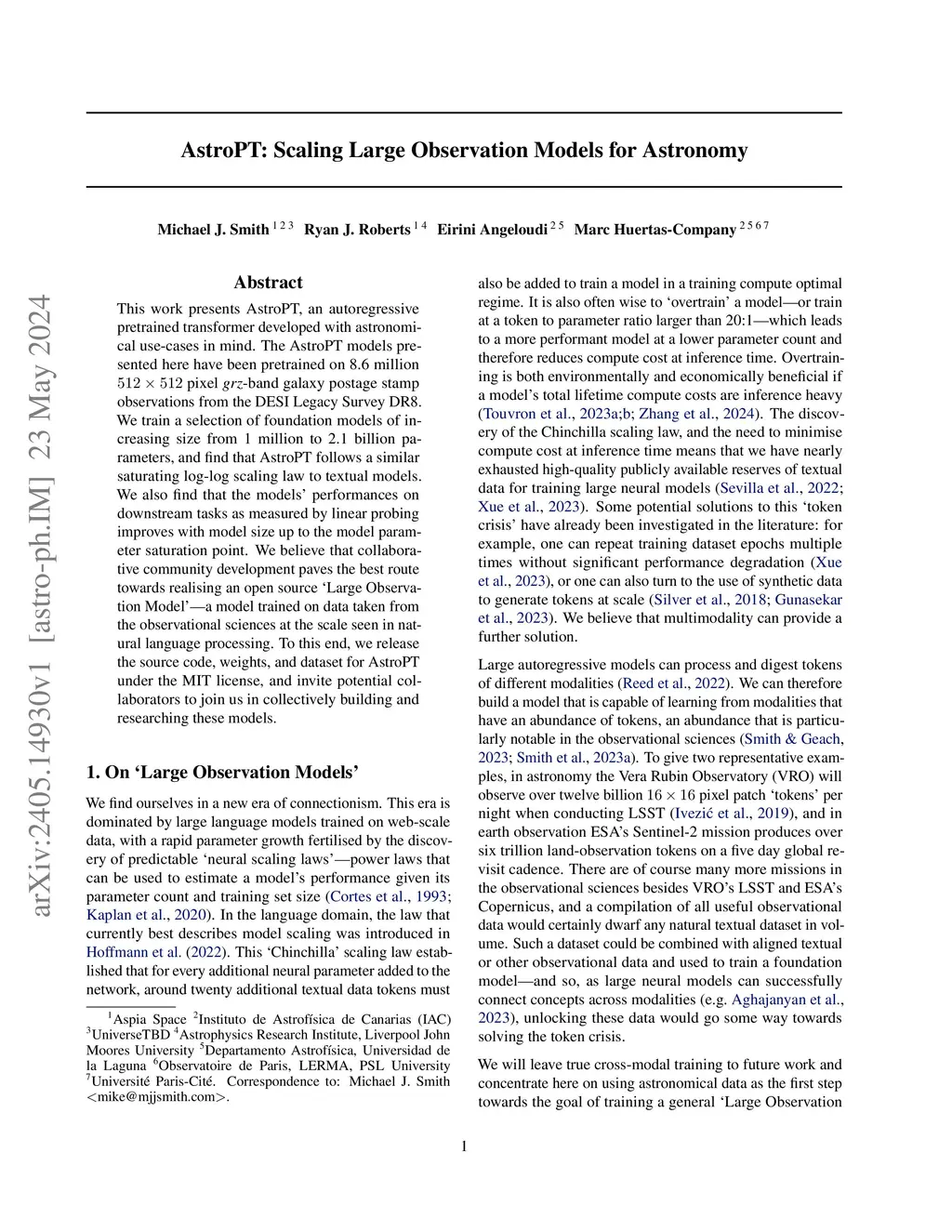 This work presents AstroPT, an autoregressive pretrained transformer developed with astronomical use-cases in mind. The AstroPT models presented here have been pretrained on 8.6 million pixel -band galaxy postage stamp observations from the DESI Legacy Survey DR8. We train a selection of foundation models of increasing size from 1 million to 2.1 billion parameters, and find that AstroPT follows a similar saturating log-log scaling law to textual models. We also find that the models' performances on downstream tasks as measured by linear probing improves with model size up to the model parameter saturation point. We believe that collaborative community development paves the best route towards realising an open source `Large Observation Model' -- a model trained on data taken from the observational sciences at the scale seen in natural language processing. To this end, we release the source code, weights, and dataset for AstroPT under the MIT license, and invite potential collaborators to join us in collectively building and researching these models.