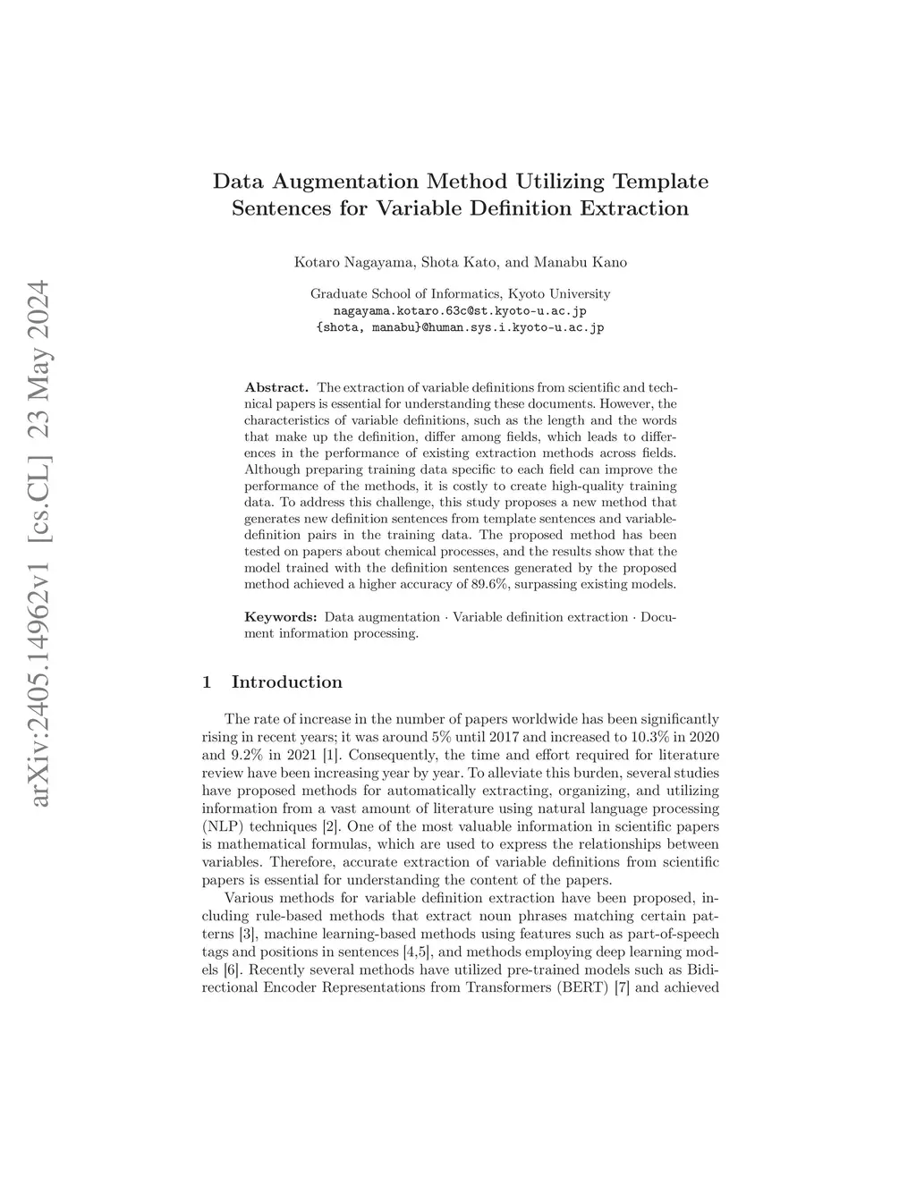 The extraction of variable definitions from scientific and technical papers is essential for understanding these documents. However, the characteristics of variable definitions, such as the length and the words that make up the definition, differ among fields, which leads to differences in the performance of existing extraction methods across fields. Although preparing training data specific to each field can improve the performance of the methods, it is costly to create high-quality training data. To address this challenge, this study proposes a new method that generates new definition sentences from template sentences and variable-definition pairs in the training data. The proposed method has been tested on papers about chemical processes, and the results show that the model trained with the definition sentences generated by the proposed method achieved a higher accuracy of 89.6%, surpassing existing models.
