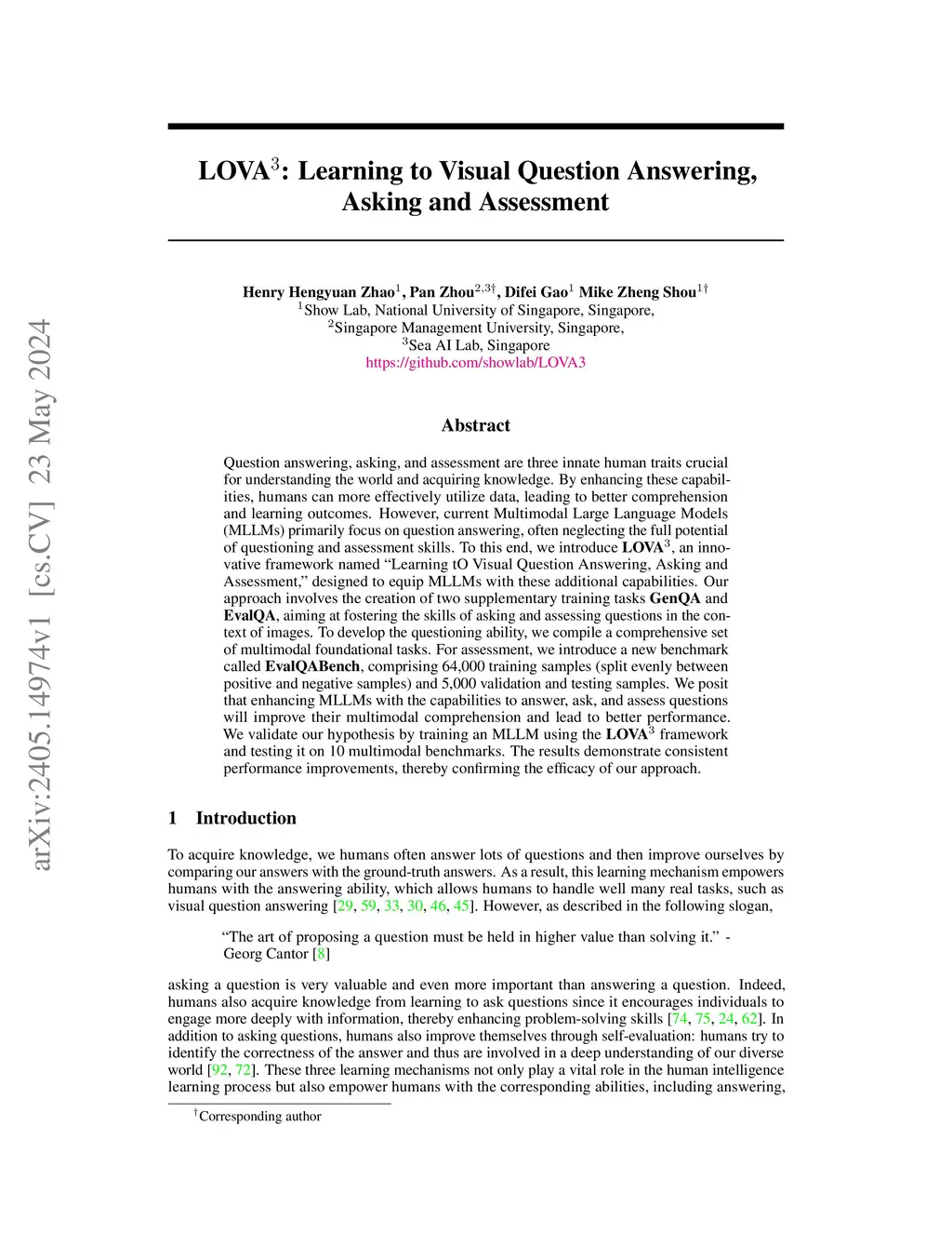 Question answering, asking, and assessment are three innate human traits crucial for understanding the world and acquiring knowledge. By enhancing these capabilities, humans can more effectively utilize data, leading to better comprehension and learning outcomes. Current Multimodal Large Language Models (MLLMs) primarily focus on question answering, often neglecting the full potential of questioning and assessment skills. Inspired by the human learning mechanism, we introduce LOVA3, an innovative framework named "Learning tO Visual question Answering, Asking and Assessment," designed to equip MLLMs with these additional capabilities. Our approach involves the creation of two supplementary training tasks GenQA and EvalQA, aiming at fostering the skills of asking and assessing questions in the context of images. To develop the questioning ability, we compile a comprehensive set of multimodal foundational tasks. For assessment, we introduce a new benchmark called EvalQABench, comprising 64,000 training samples (split evenly between positive and negative samples) and 5,000 validation and testing samples. We posit that enhancing MLLMs with the capabilities to answer, ask, and assess questions will enhance their multimodal comprehension, ultimately improving overall performance. To validate this hypothesis, we train MLLMs using the LOVA3 framework and evaluate them on a range of multimodal datasets and benchmarks. Our results demonstrate consistent performance gains, underscoring the critical role of these additional tasks in fostering comprehensive intelligence in MLLMs. The code is available atthis https URL.