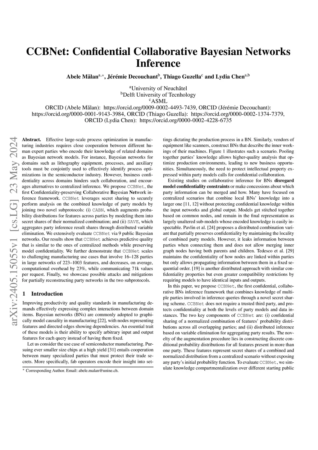 Effective large-scale process optimization in manufacturing industries requires close cooperation between different human expert parties who encode their knowledge of related domains as Bayesian network models. For instance, Bayesian networks for domains such as lithography equipment, processes, and auxiliary tools must be conjointly used to effectively identify process optimizations in the semiconductor industry. However, business confidentiality across domains hinders such collaboration, and encourages alternatives to centralized inference. We propose CCBNet, the first Confidentiality-preserving Collaborative Bayesian Network inference framework. CCBNet leverages secret sharing to securely perform analysis on the combined knowledge of party models by joining two novel subprotocols: (i) CABN, which augments probability distributions for features across parties by modeling them into secret shares of their normalized combination; and (ii) SAVE, which aggregates party inference result shares through distributed variable elimination. We extensively evaluate CCBNet via 9 public Bayesian networks. Our results show that CCBNet achieves predictive quality that is similar to the ones of centralized methods while preserving model confidentiality. We further demonstrate that CCBNet scales to challenging manufacturing use cases that involve 16-128 parties in large networks of 223-1003 features, and decreases, on average, computational overhead by 23%, while communicating 71k values per request. Finally, we showcase possible attacks and mitigations for partially reconstructing party networks in the two subprotocols.