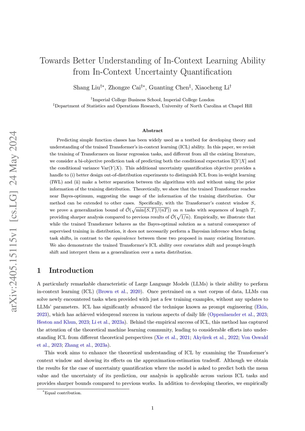 Predicting simple function classes has been widely used as a testbed for developing theory and understanding of the trained Transformer's in-context learning (ICL) ability. In this paper, we revisit the training of Transformers on linear regression tasks, and different from all the existing literature, we consider a bi-objective prediction task of predicting both the conditional expectation and the conditional variance Var. This additional uncertainty quantification objective provides a handle to (i) better design out-of-distribution experiments to distinguish ICL from in-weight learning (IWL) and (ii) make a better separation between the algorithms with and without using the prior information of the training distribution. Theoretically, we show that the trained Transformer reaches near Bayes-optimum, suggesting the usage of the information of the training distribution. Our method can be extended to other cases. Specifically, with the Transformer's context window , we prove a generalization bound of on tasks with sequences of length , providing sharper analysis compared to previous results of . Empirically, we illustrate that while the trained Transformer behaves as the Bayes-optimal solution as a natural consequence of supervised training in distribution, it does not necessarily perform a Bayesian inference when facing task shifts, in contrast to the \textit{equivalence} between these two proposed in many existing literature. We also demonstrate the trained Transformer's ICL ability over covariates shift and prompt-length shift and interpret them as a generalization over a meta distribution.