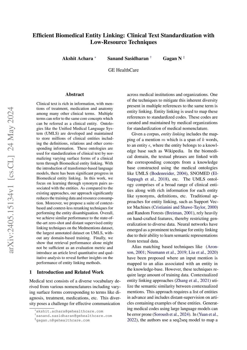 Clinical text is rich in information, with mentions of treatment, medication and anatomy among many other clinical terms. Multiple terms can refer to the same core concepts which can be referred as a clinical entity. Ontologies like the Unified Medical Language System (UMLS) are developed and maintained to store millions of clinical entities including the definitions, relations and other corresponding information. These ontologies are used for standardization of clinical text by normalizing varying surface forms of a clinical term through Biomedical entity linking. With the introduction of transformer-based language models, there has been significant progress in Biomedical entity linking. In this work, we focus on learning through synonym pairs associated with the entities. As compared to the existing approaches, our approach significantly reduces the training data and resource consumption. Moreover, we propose a suite of context-based and context-less reranking techniques for performing the entity disambiguation. Overall, we achieve similar performance to the state-of-the-art zero-shot and distant supervised entity linking techniques on the Medmentions dataset, the largest annotated dataset on UMLS, without any domain-based training. Finally, we show that retrieval performance alone might not be sufficient as an evaluation metric and introduce an article level quantitative and qualitative analysis to reveal further insights on the performance of entity linking methods.