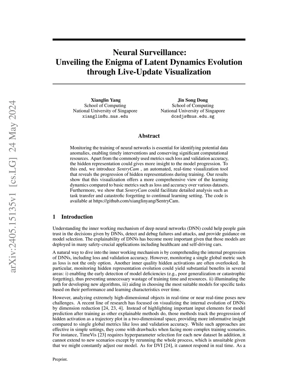 Monitoring the inner state of deep neural networks is essential for auditing the learning process and enabling timely interventions. While conventional metrics like validation loss offer a surface-level view of performance, the evolution of a model's hidden representations provides a deeper, complementary window into its internal dynamics. However, the literature lacks a real-time tool to monitor these crucial internal states. To address this, we introduce SentryCam, a live-update visualization framework that tracks the progression of hidden representations throughout training. SentryCam produces high-fidelity visualizations of the evolving representation space with minimal latency, serving as a powerful dashboard for understanding how a model learns. We quantitatively validate the faithfulness of SentryCam's visualizations across diverse datasets and architectures (ResNet, ViT). Furthermore, we demonstrate SentryCam's practical utility for model auditing through a case study on training instability. We designed an automated auditing system with geometry-based alerts that successfully identified impending model failure up to 7 epochs earlier than was evident from the validation loss curve. SentryCam's flexible framework is easily adaptable, supporting both the exploratory analysis and proactive auditing essential for robust model development. The code is available atthis https URL.