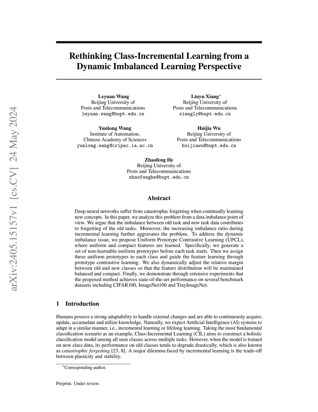 Deep neural networks suffer from catastrophic forgetting when continually learning new concepts. In this paper, we analyze this problem from a data imbalance point of view. We argue that the imbalance between old task and new task data contributes to forgetting of the old tasks. Moreover, the increasing imbalance ratio during incremental learning further aggravates the problem. To address the dynamic imbalance issue, we propose Uniform Prototype Contrastive Learning (UPCL), where uniform and compact features are learned. Specifically, we generate a set of non-learnable uniform prototypes before each task starts. Then we assign these uniform prototypes to each class and guide the feature learning through prototype contrastive learning. We also dynamically adjust the relative margin between old and new classes so that the feature distribution will be maintained balanced and compact. Finally, we demonstrate through extensive experiments that the proposed method achieves state-of-the-art performance on several benchmark datasets including CIFAR100, ImageNet100 and TinyImageNet.