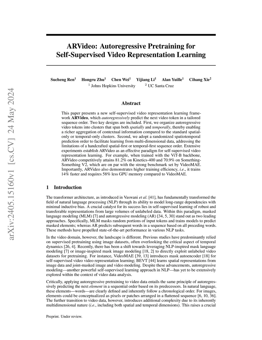 ARVideo: Autoregressive Pretraining for Self-Supervised Video