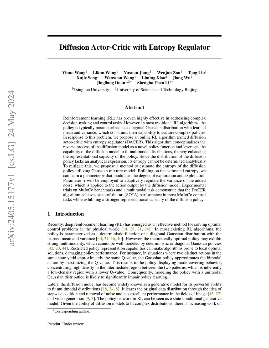Reinforcement learning (RL) has proven highly effective in addressing complex decision-making and control tasks. However, in most traditional RL algorithms, the policy is typically parameterized as a diagonal Gaussian distribution with learned mean and variance, which constrains their capability to acquire complex policies. In response to this problem, we propose an online RL algorithm termed diffusion actor-critic with entropy regulator (DACER). This algorithm conceptualizes the reverse process of the diffusion model as a novel policy function and leverages the capability of the diffusion model to fit multimodal distributions, thereby enhancing the representational capacity of the policy. Since the distribution of the diffusion policy lacks an analytical expression, its entropy cannot be determined analytically. To mitigate this, we propose a method to estimate the entropy of the diffusion policy utilizing Gaussian mixture model. Building on the estimated entropy, we can learn a parameter that modulates the degree of exploration and exploitation. Parameter will be employed to adaptively regulate the variance of the added noise, which is applied to the action output by the diffusion model. Experimental trials on MuJoCo benchmarks and a multimodal task demonstrate that the DACER algorithm achieves state-of-the-art (SOTA) performance in most MuJoCo control tasks while exhibiting a stronger representational capacity of the diffusion policy.